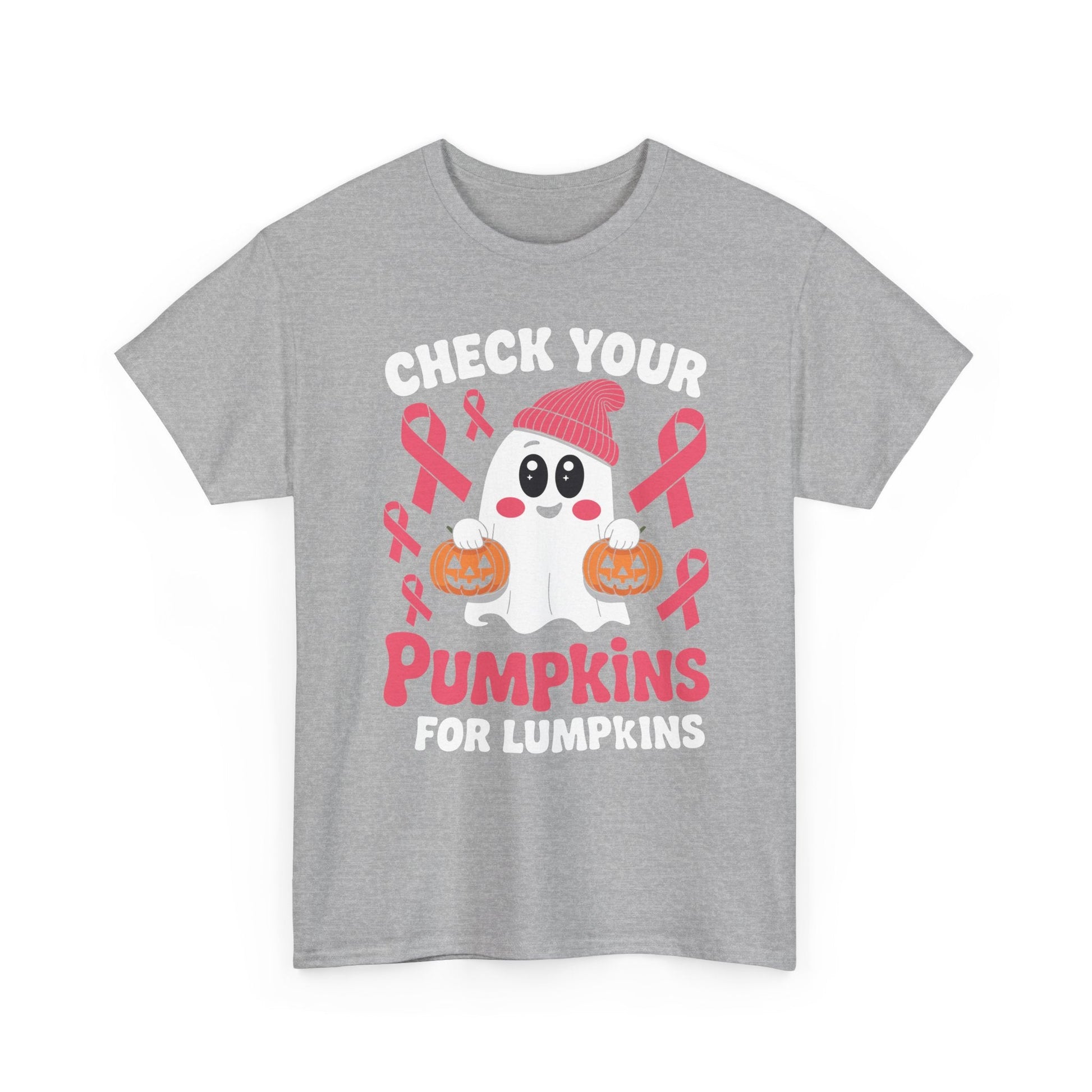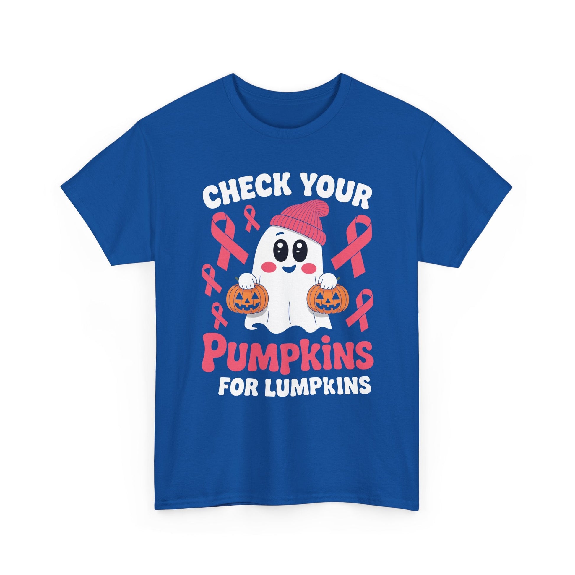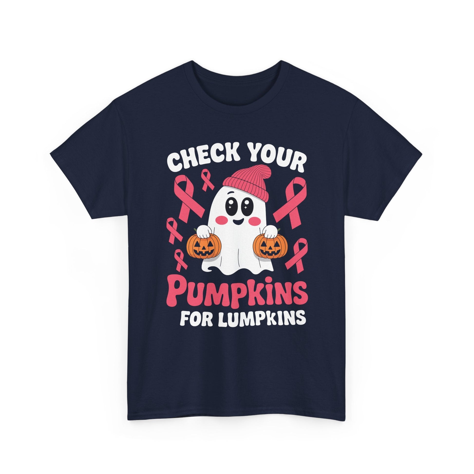 This Breast Cancer Halloween Boo Ghost Check Your Pumpkins T-Shirt is a fun and festive addition to any wardrobe. Perfect for those who want to show support for breast cancer awareness during Halloween. The design features a spooky ghost and a playful message, adding a touch of whimsy to your outfit. Ideal for women looking to make a statement and spread awareness for a good cause.