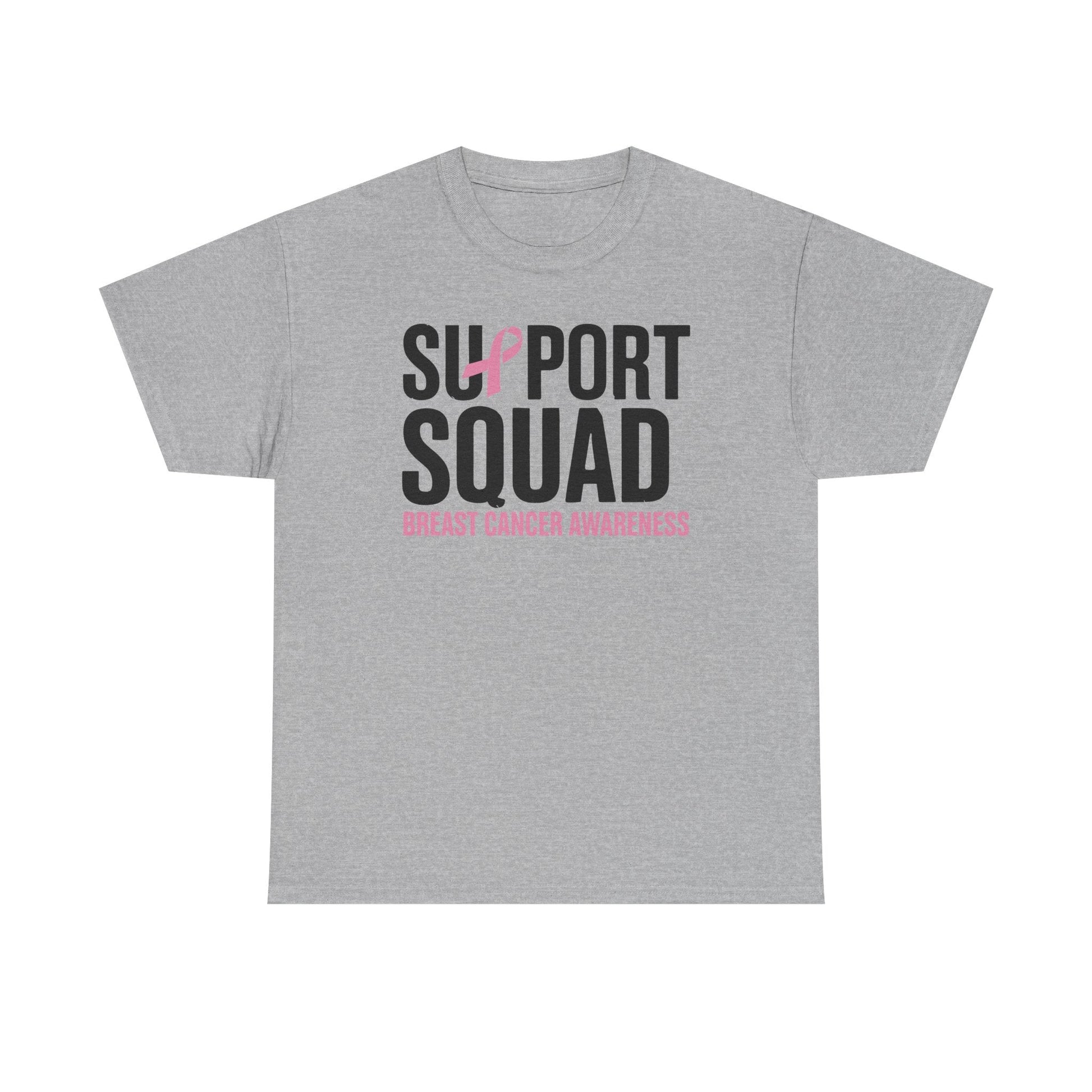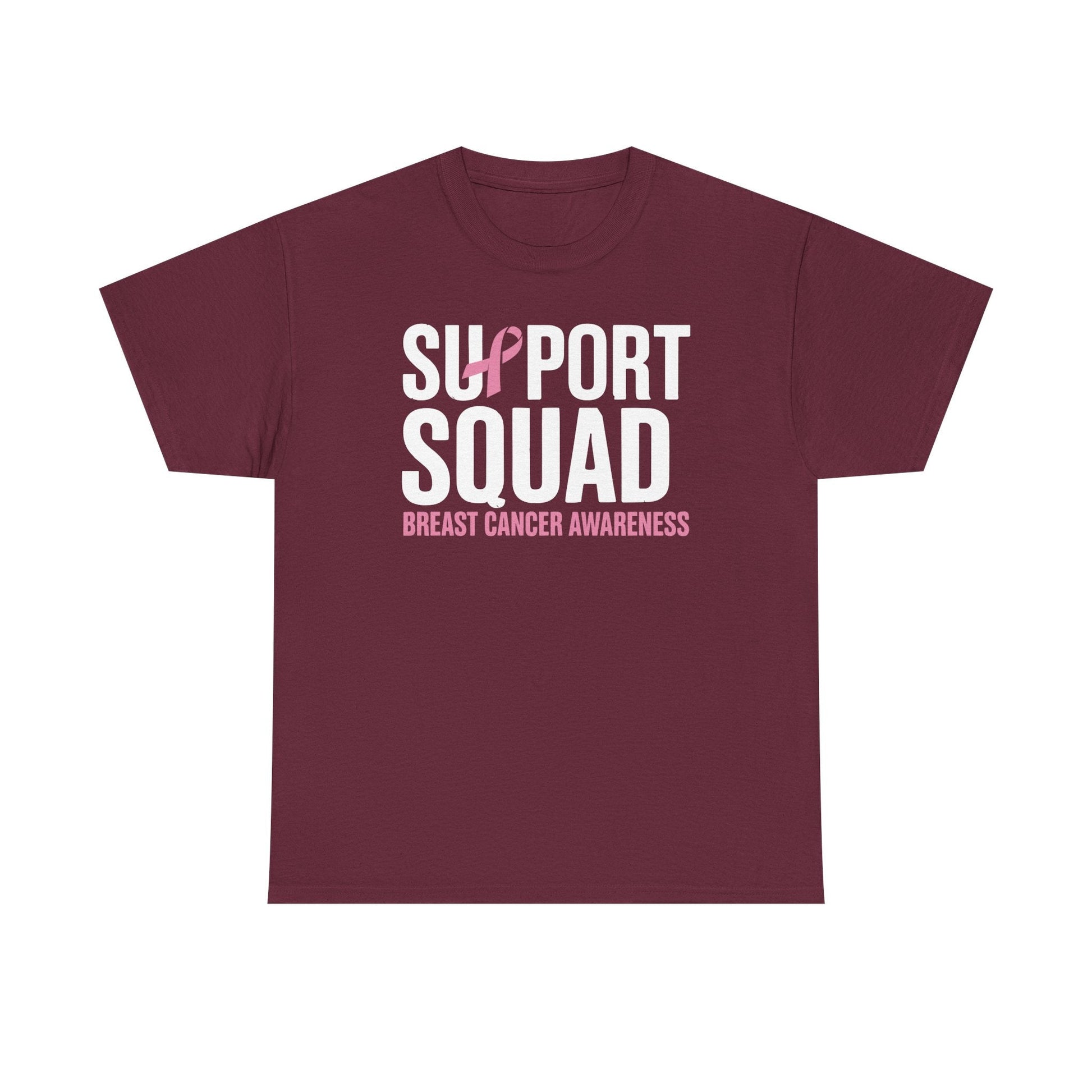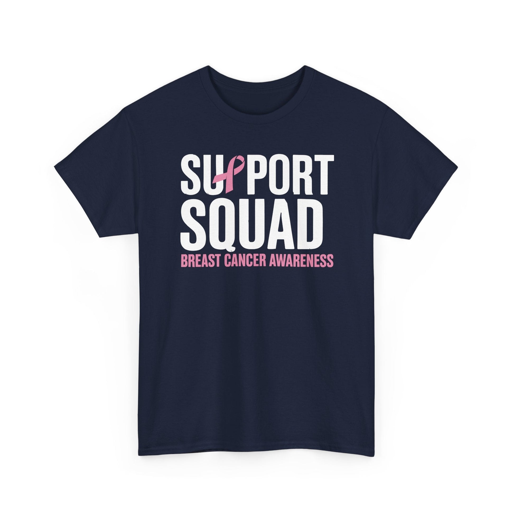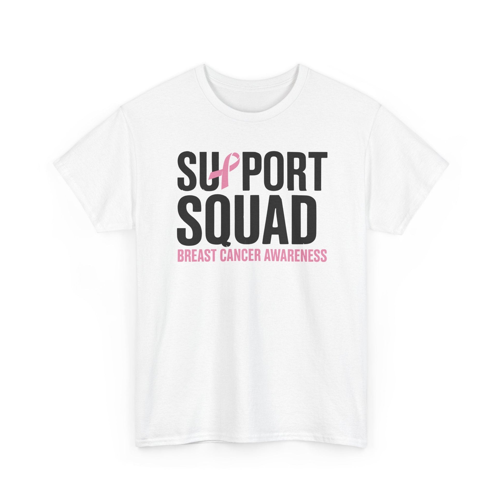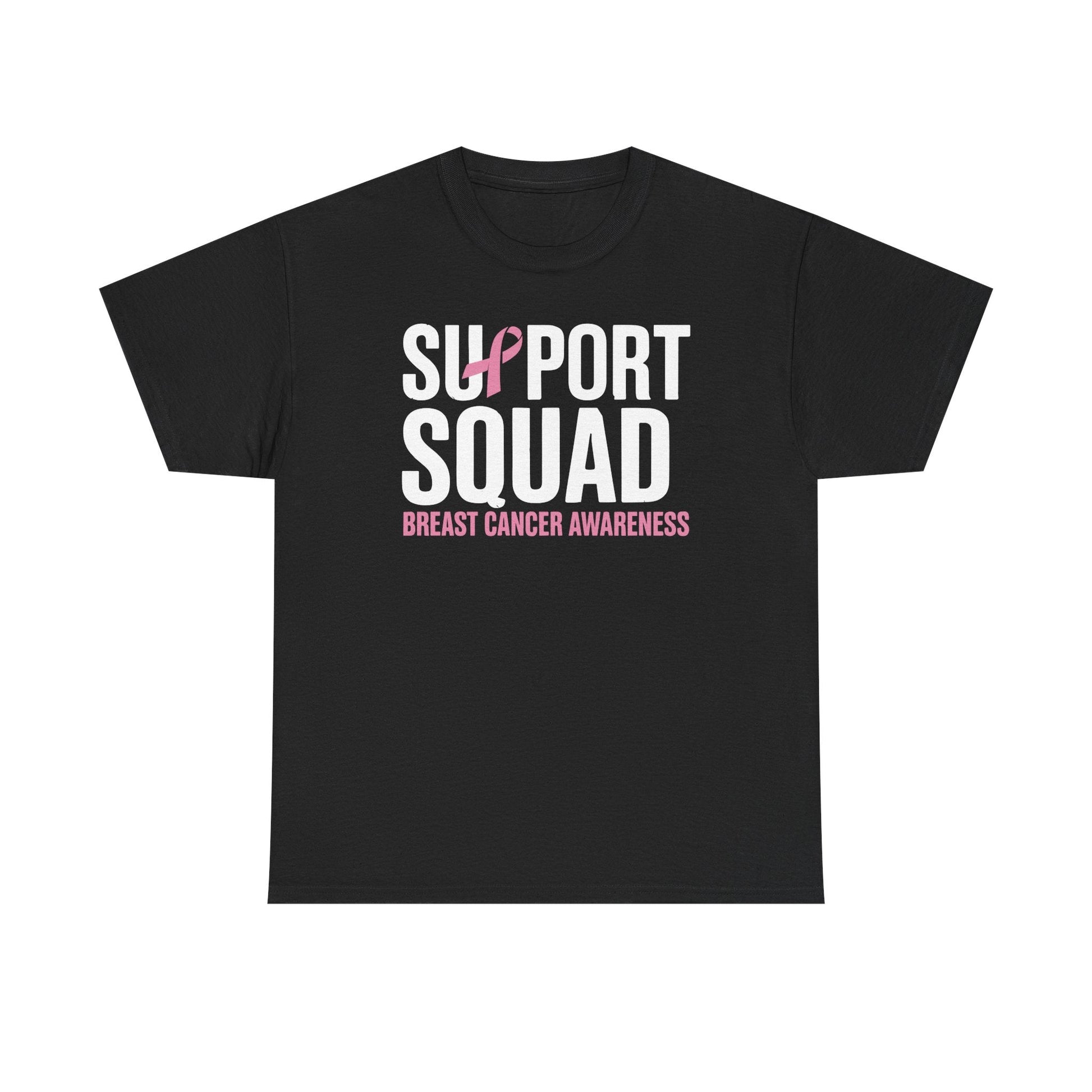 Show your support for Breast Cancer Awareness with this Support Squad Breast Cancer Awareness T-Shirt. Made from high-quality cotton fabric, this unisex tee features a classic fit and a comfortable crew neckline, suitable for adults. Perfect for wearing during Breast Cancer Awareness Month or any fundraising events to show solidarity and support.