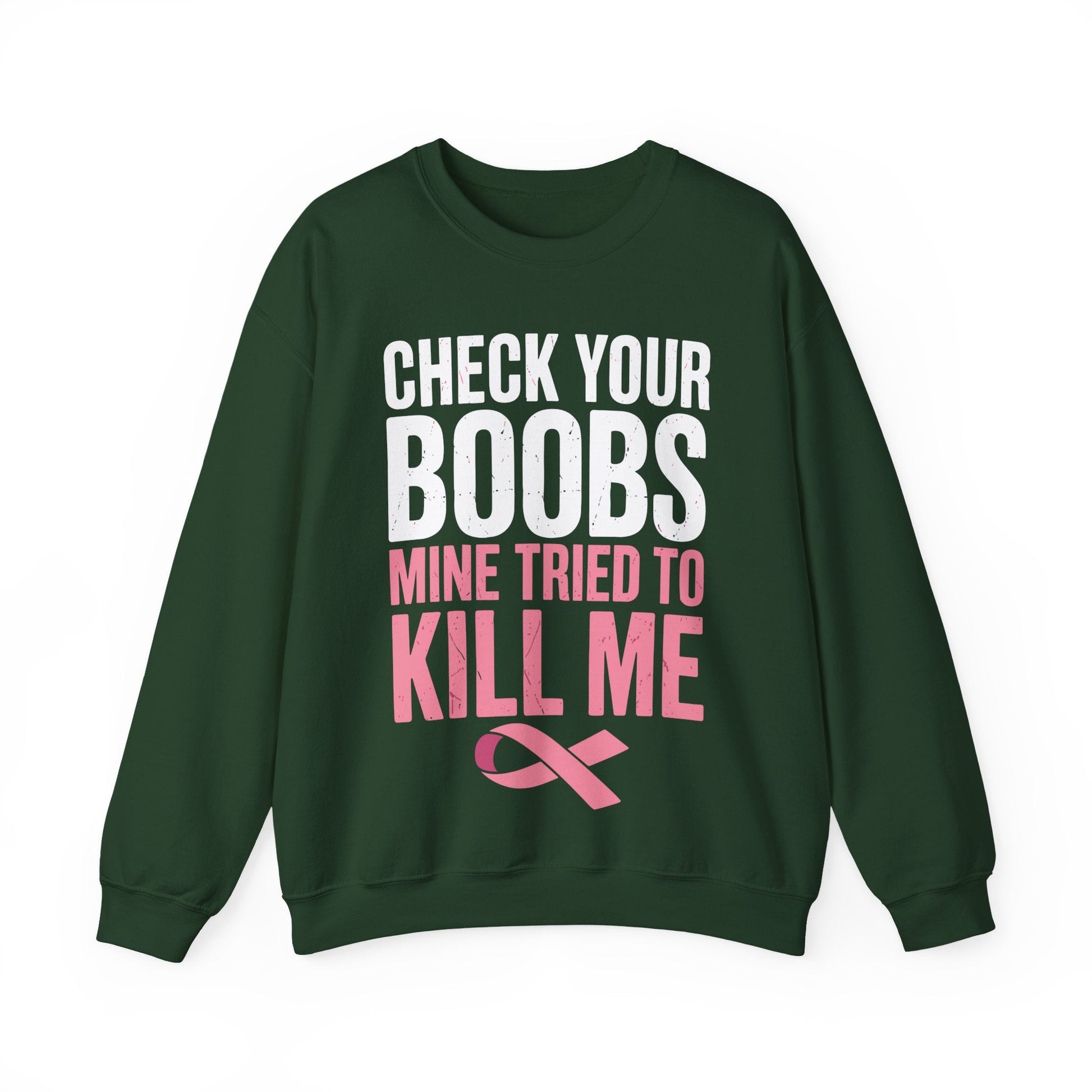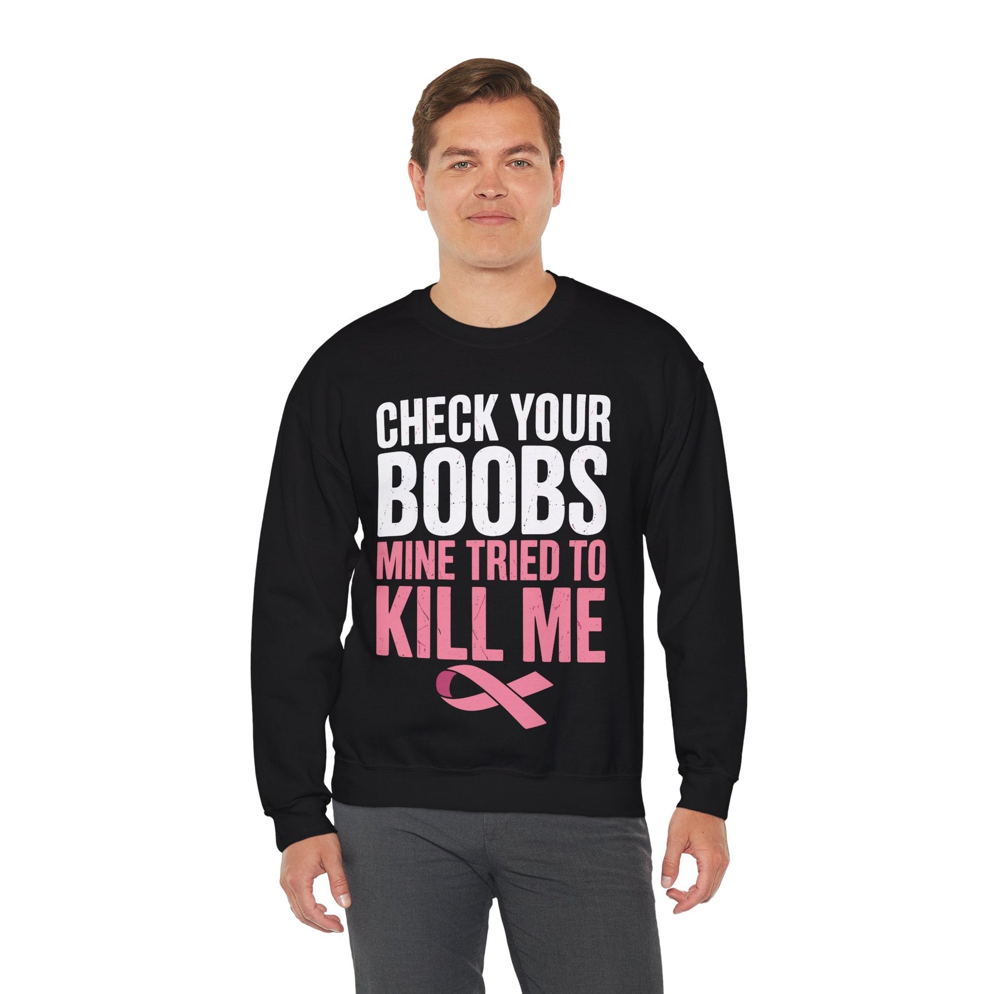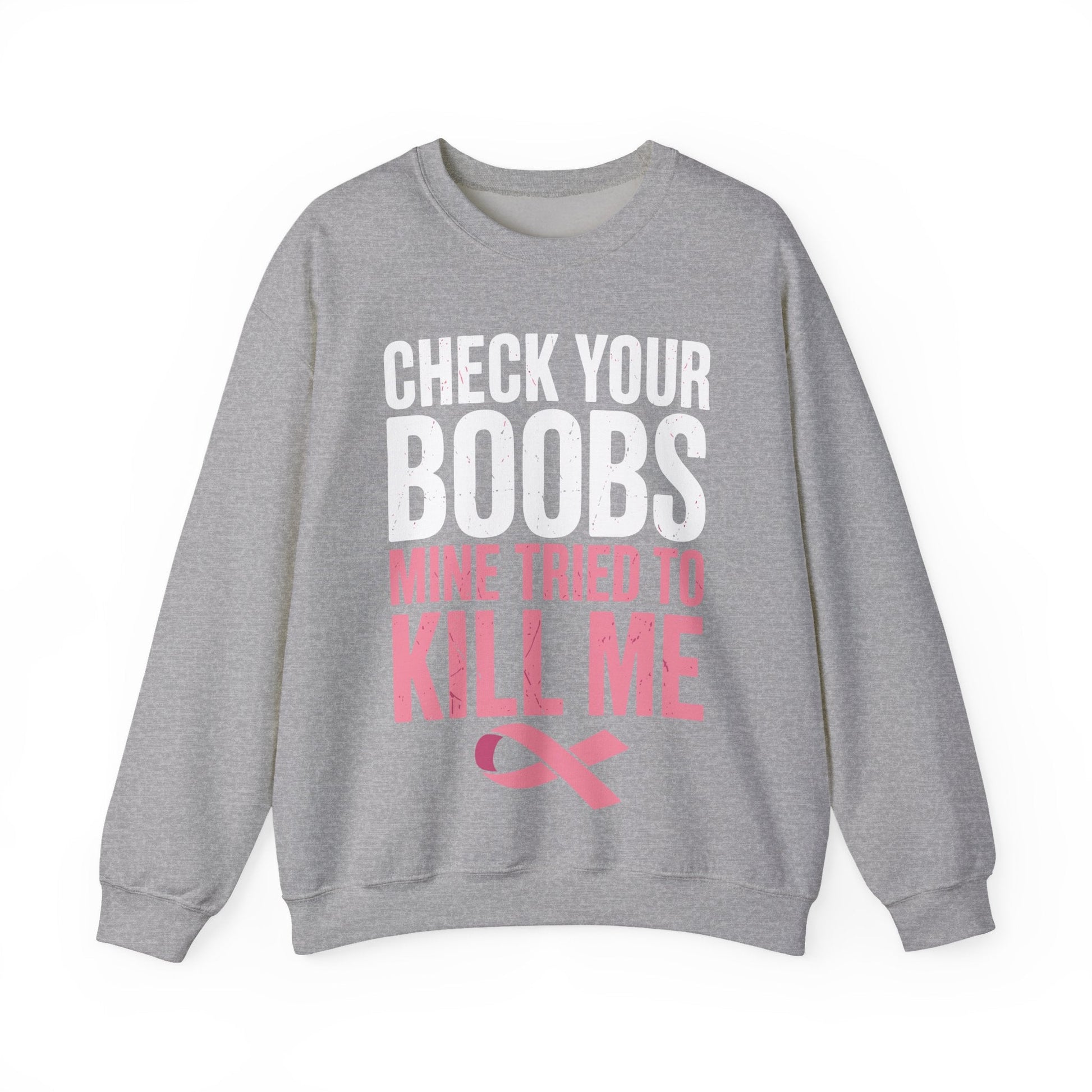 Check Your Boobs Mine Tried To Kill Me Funny Breast Cancer Sweatshirt