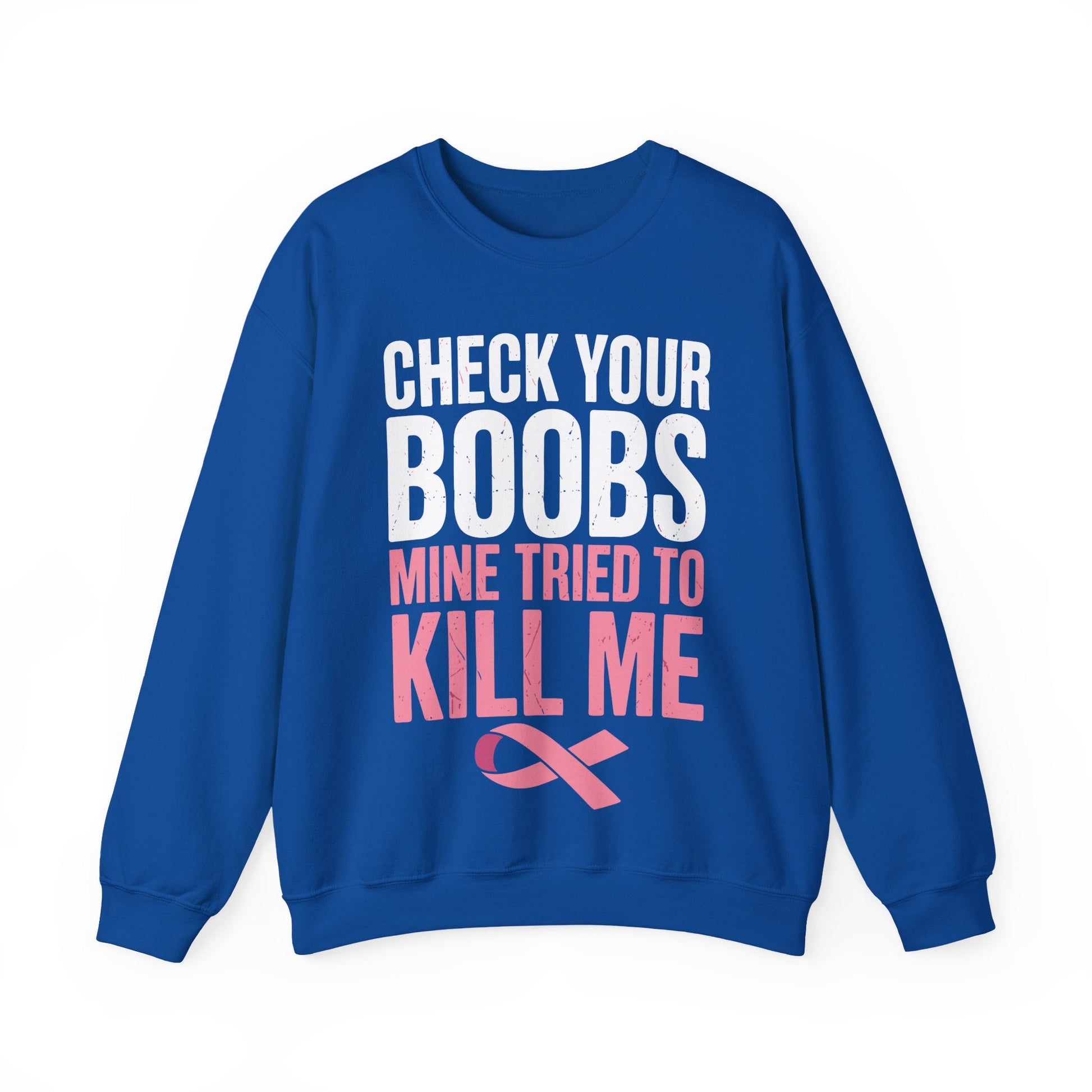 The “Check Your Boobs Mine Tried To Kill Me” sweatshirt turns survival into a bold reminder. Whether you're raising awareness, supporting a loved one, or sharing your journey, this sweatshirt solves the problem of bland gear with humor, warmth, and purpose.