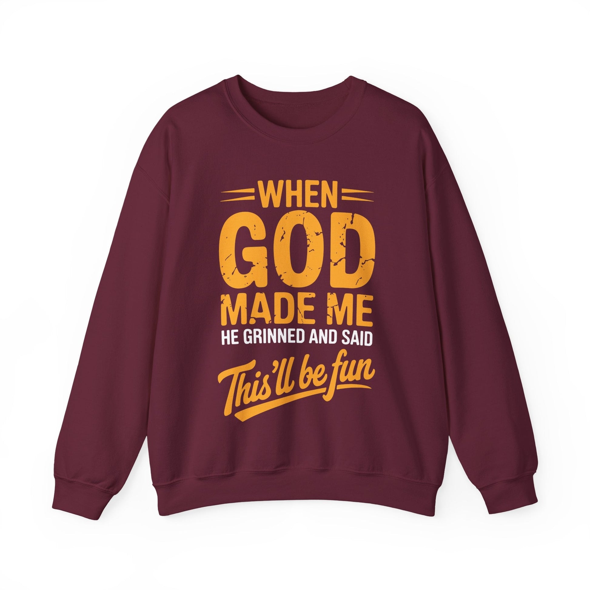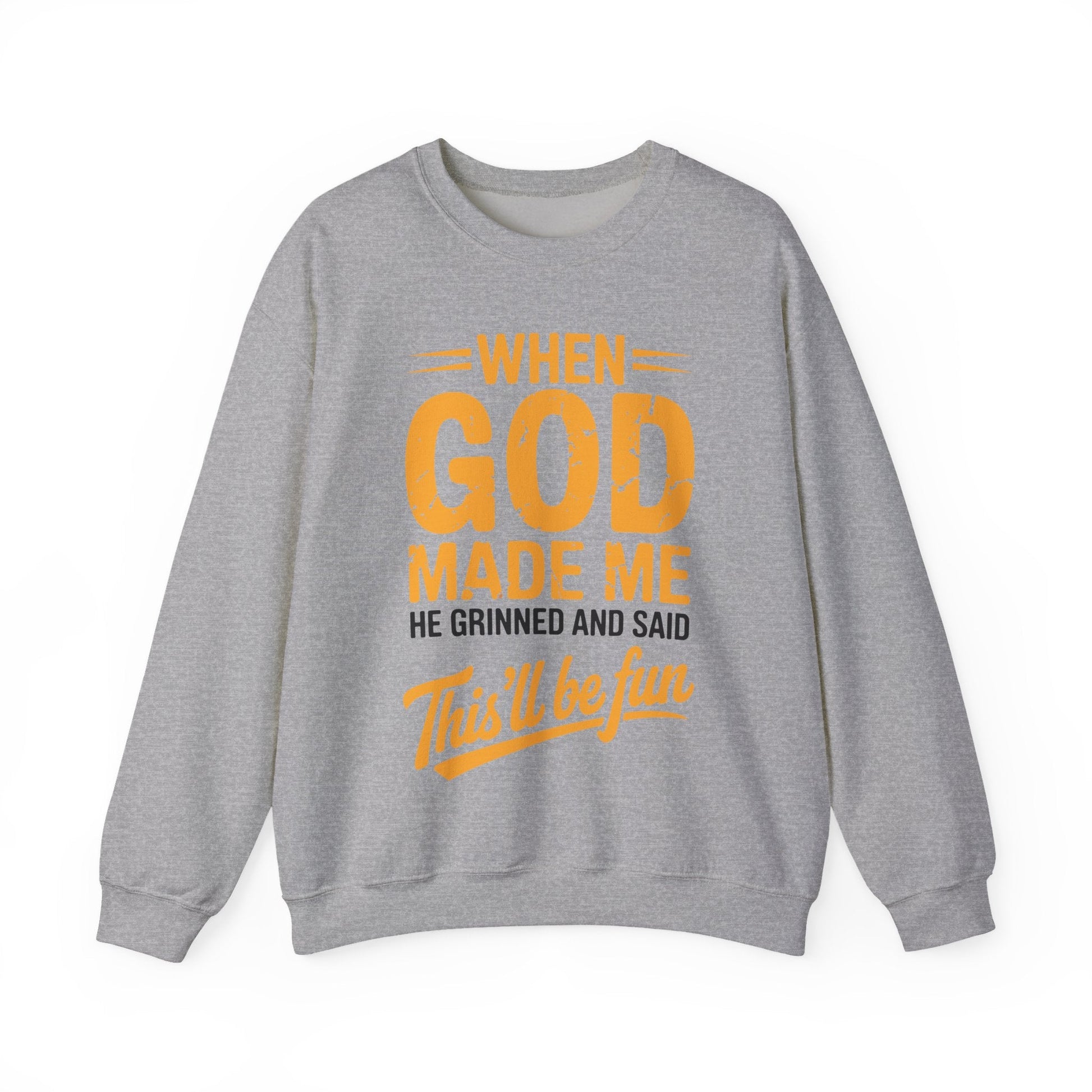 Ever feel like your personality was handcrafted for chaos, comedy, and a little divine mischief? This sweatshirt says what everyone’s been thinking: “When God made me, He said… this’ll be fun.” Whether you’re the class clown, the office jokester, or just someone who embraces their quirks, this sweatshirt is your badge of honor.