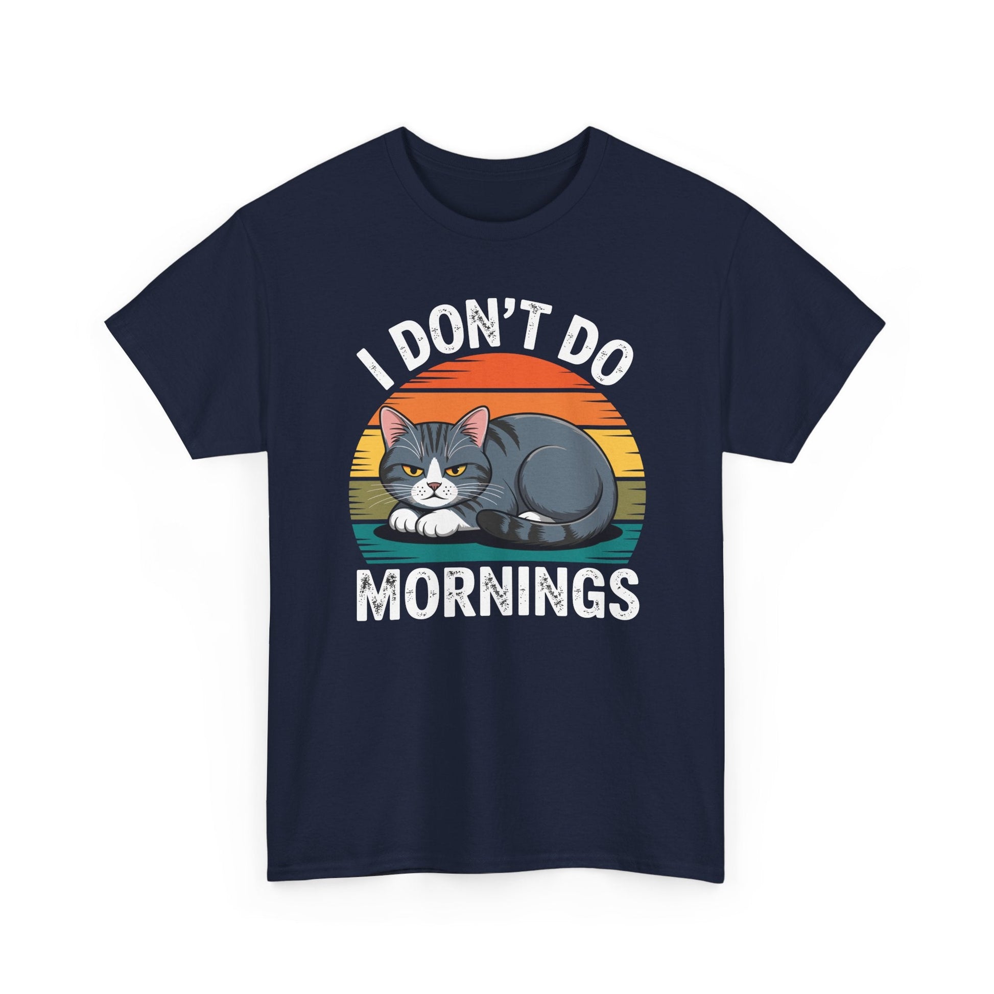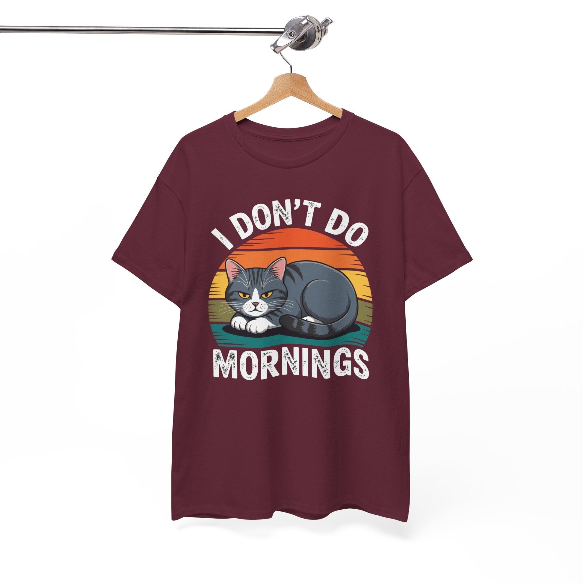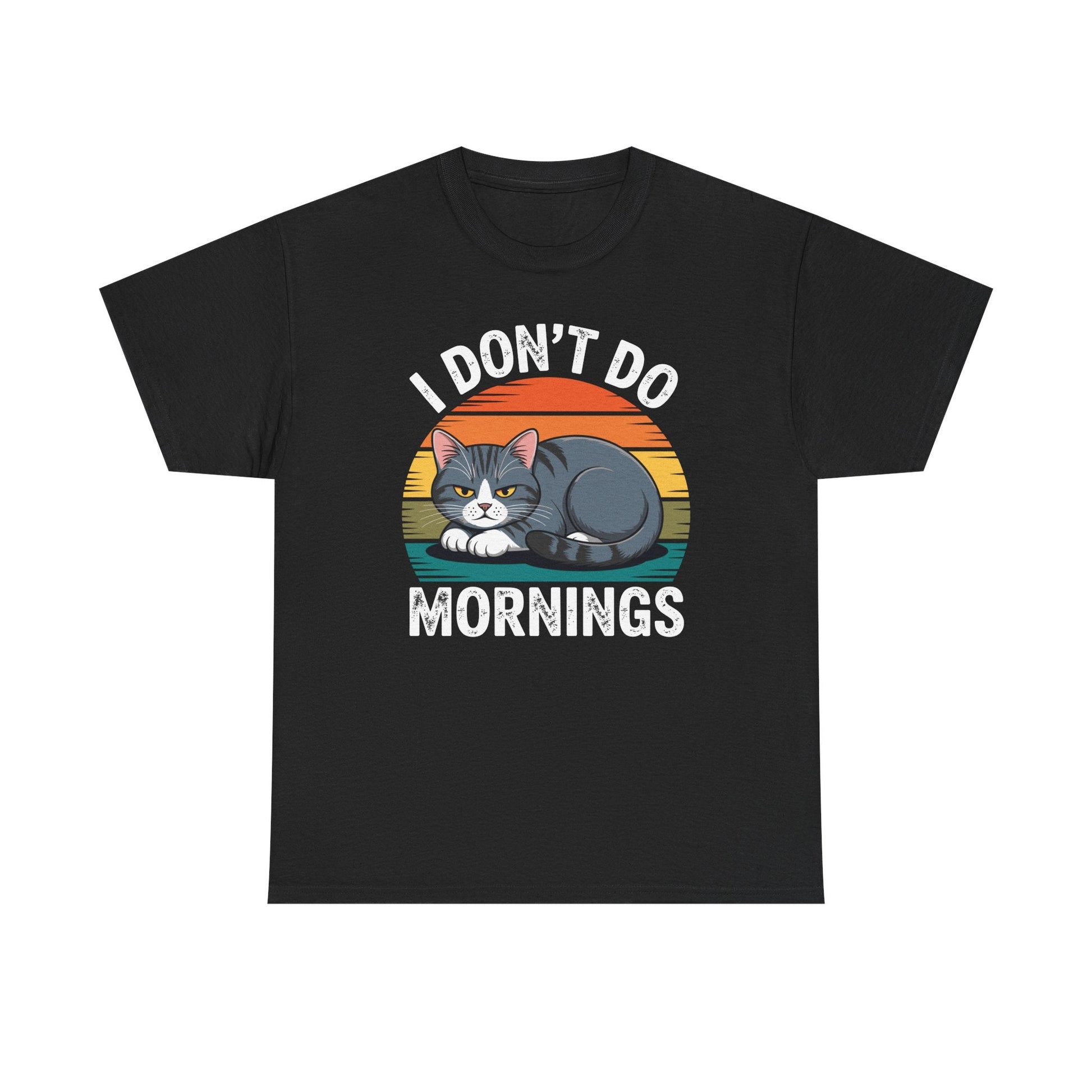 · Sleepy Cat Design: Features a grumpy cartoon cat paired with the phrase “I Don’t Do Morning”—perfect for expressing your early-hour resistance with style