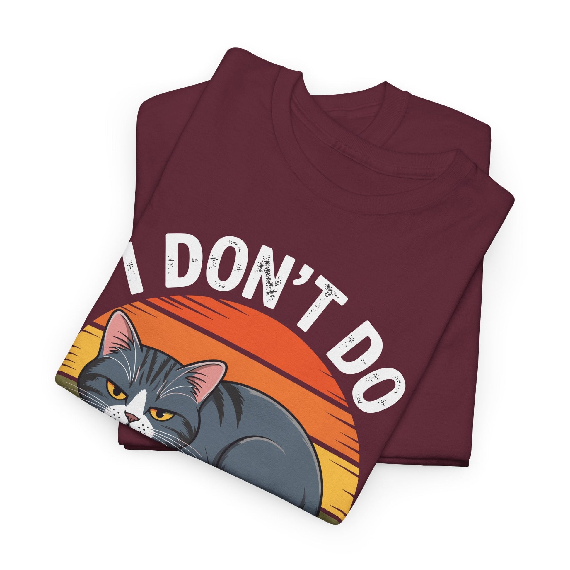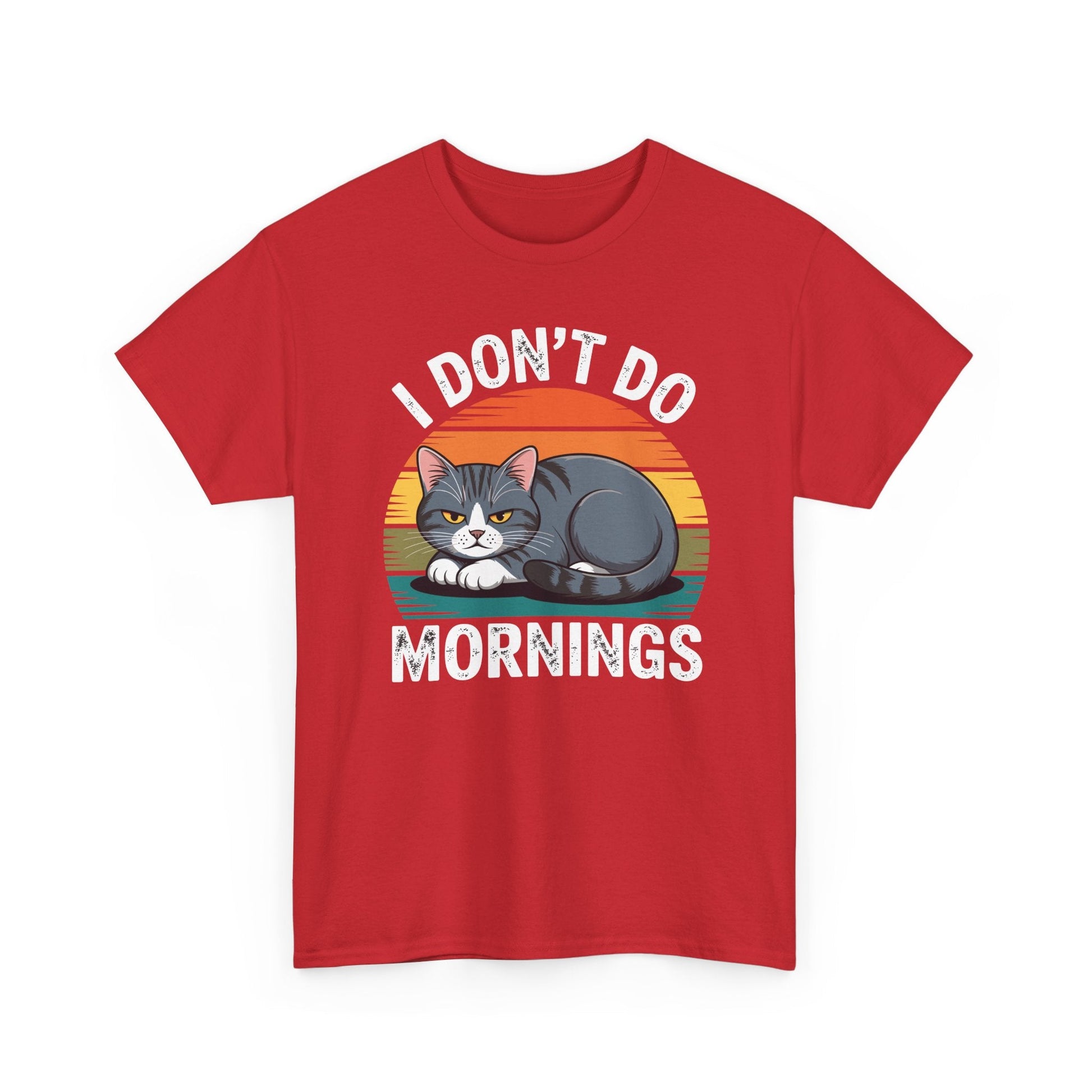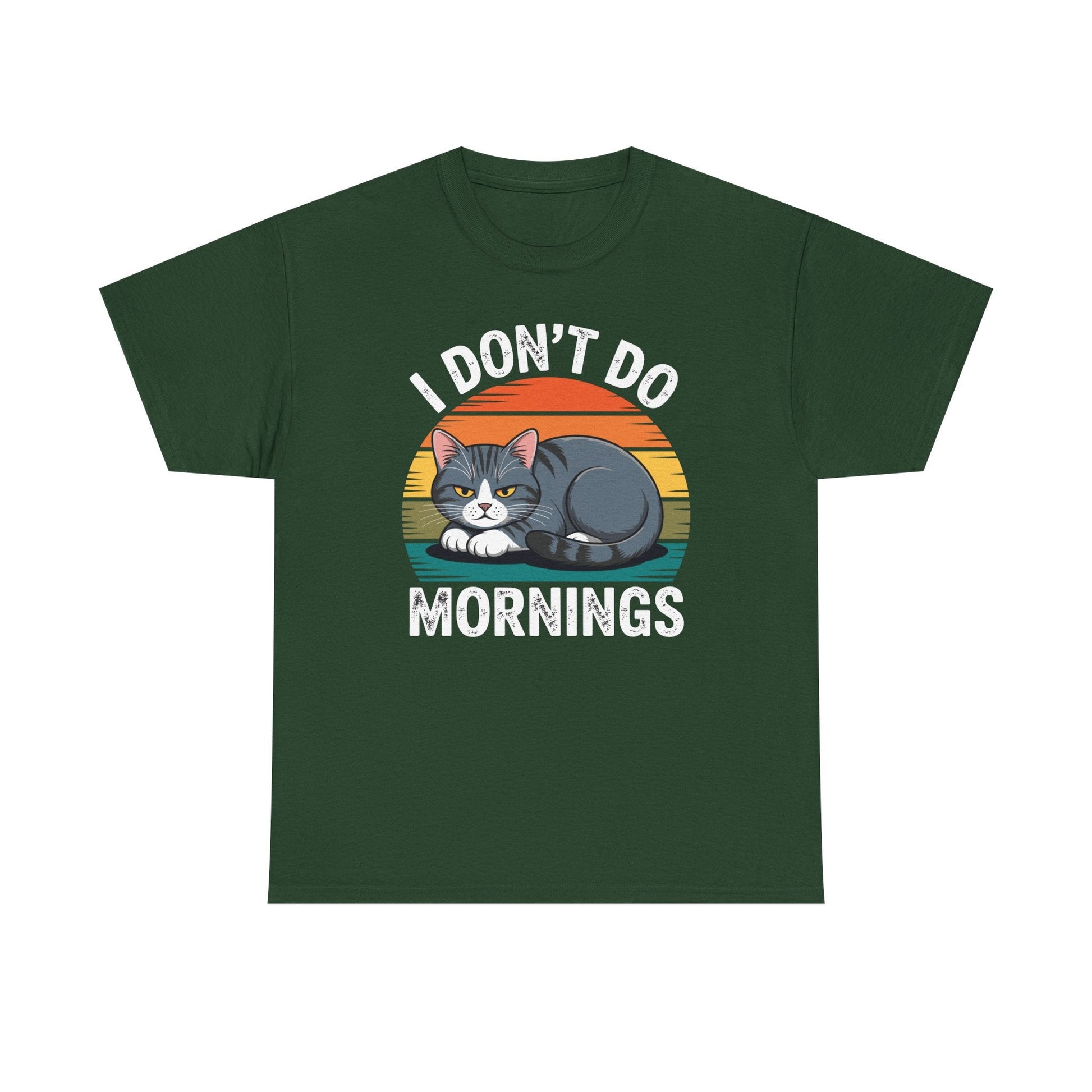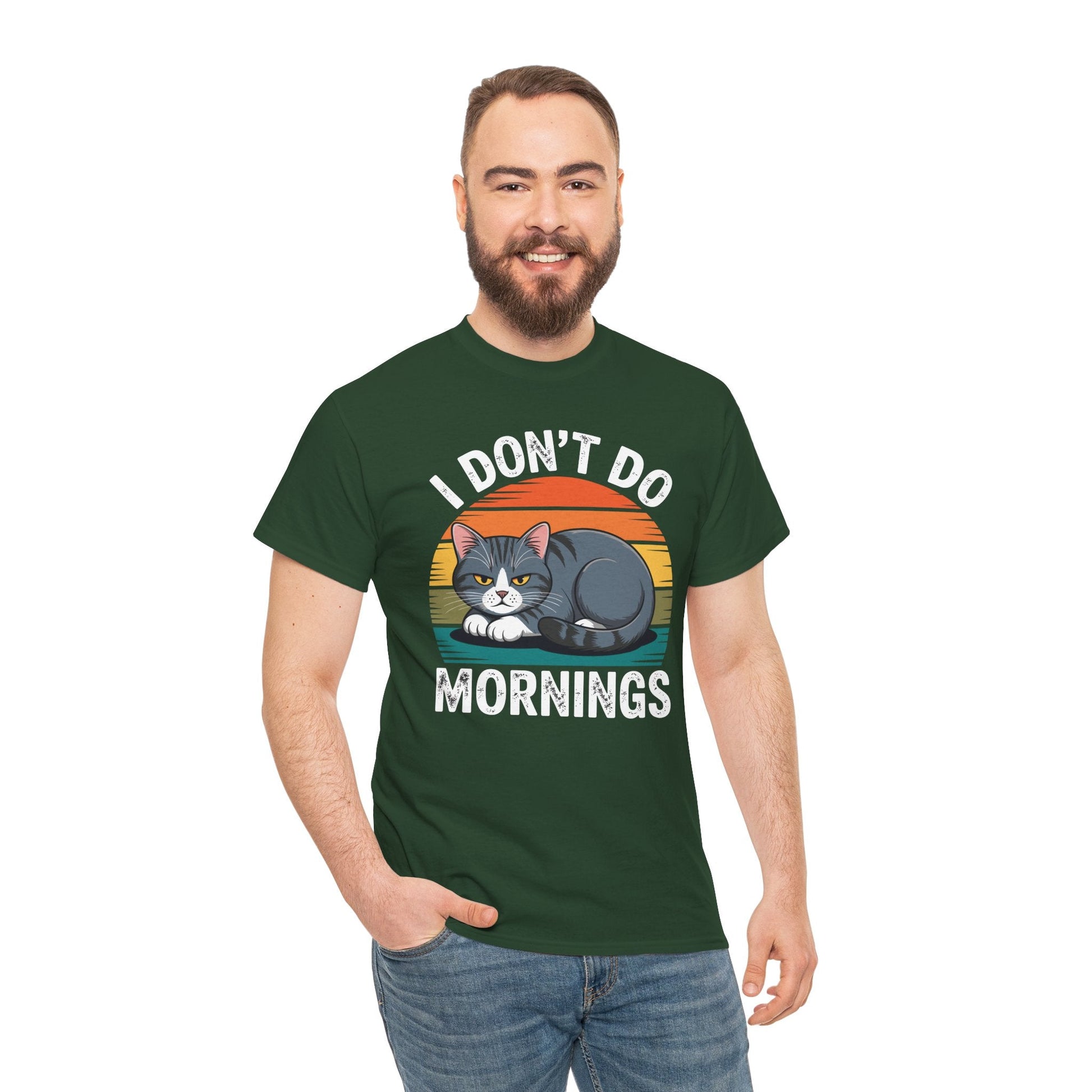 · Sleepy Cat Design: Features a grumpy cartoon cat paired with the phrase “I Don’t Do Morning”—perfect for expressing your early-hour resistance with style