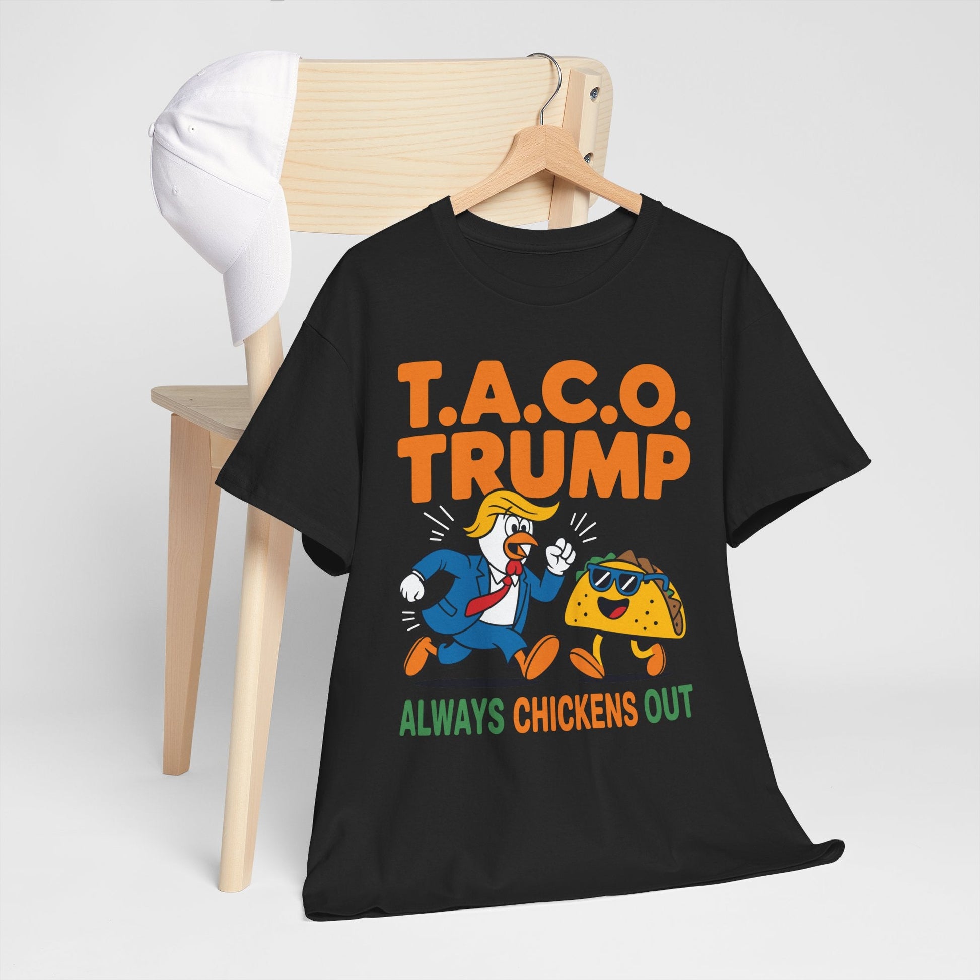 Ever wonder what happens when politics meets tacos? Spoiler alert: someone always chickens out. The T.A.C.O (Trump Always Chickens Out) T-Shirt is a spicy blend of satire, style, and sass. Whether you're protesting, partying, or just grabbing tacos on Tuesday, this tee delivers a punch of humor with a side of truth.