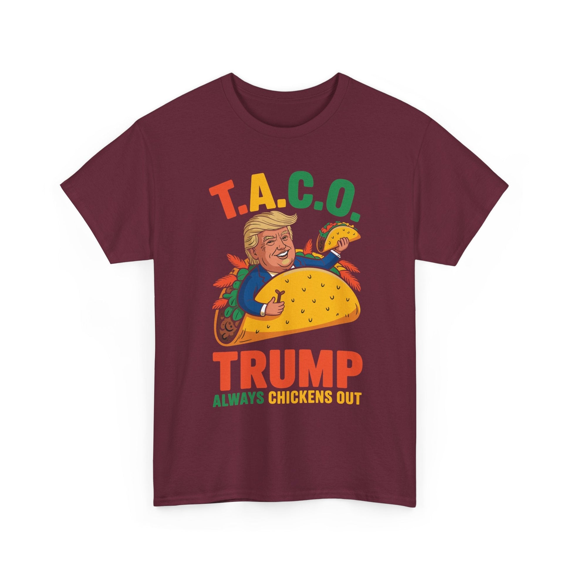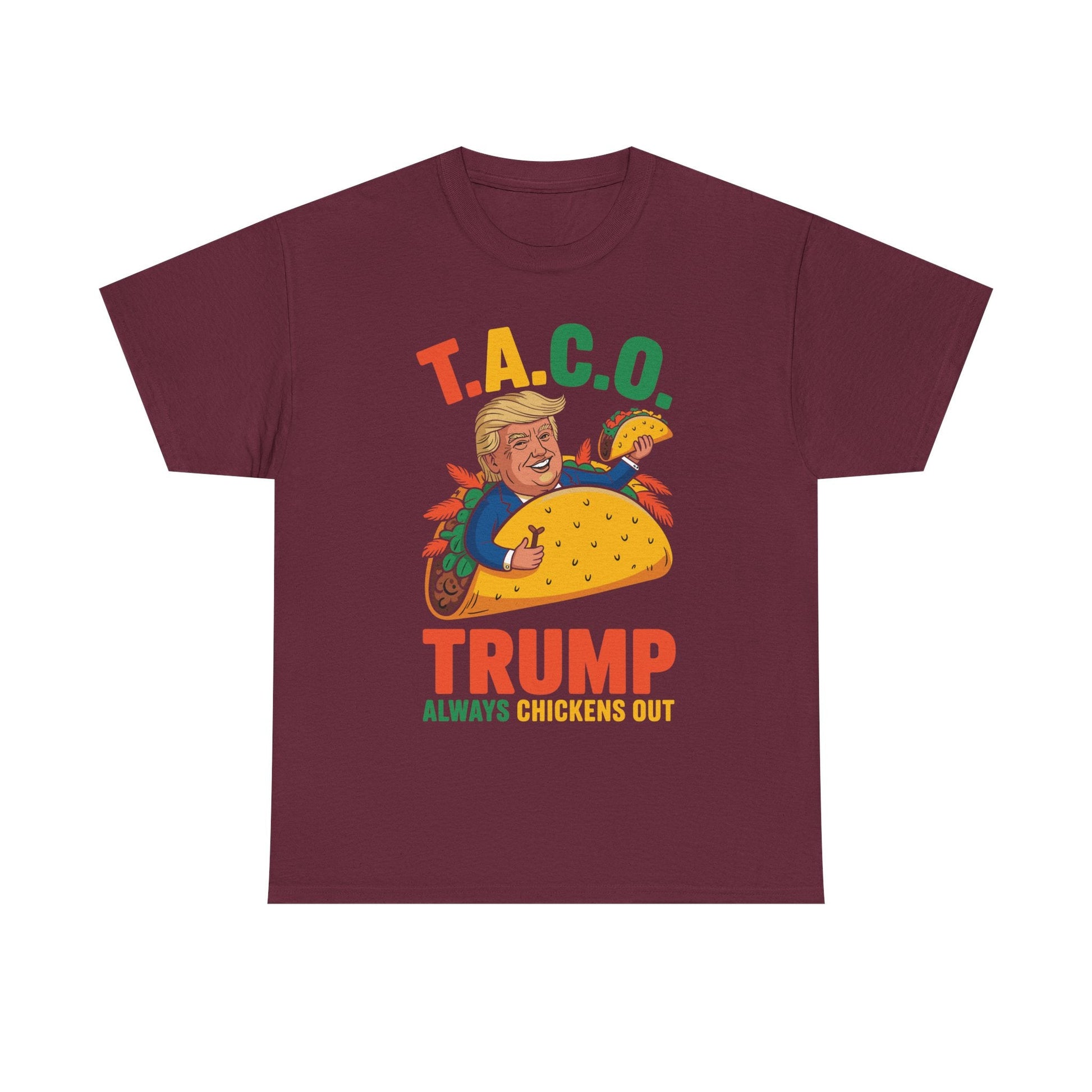 Bold Design That Speaks Volumes: Featuring a clever acronym—T.A.C.O. (Trump Always Chickens Out)—this graphic tee blends food humor with political satire, making it a conversation starter at rallies, parties, or taco Tuesdays.