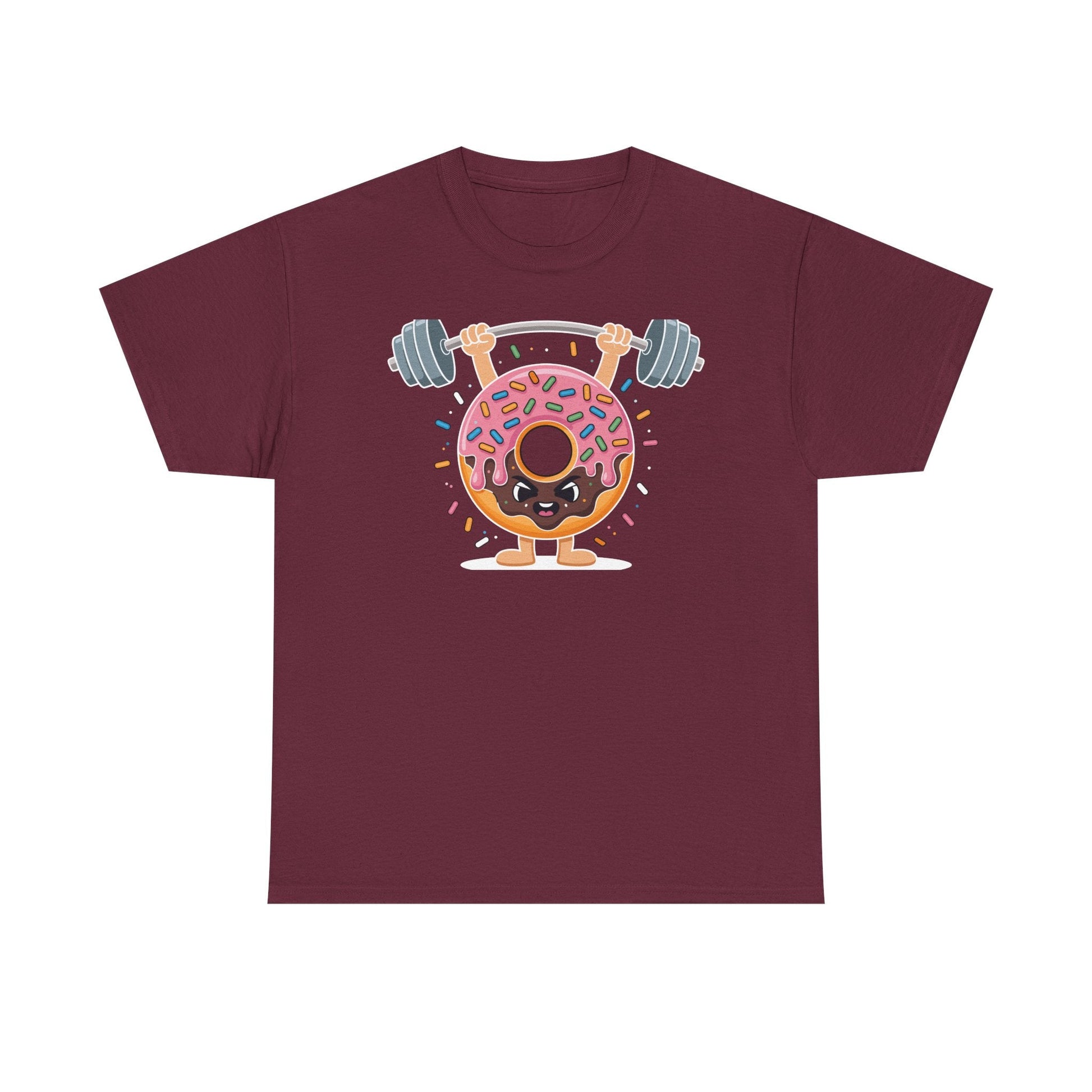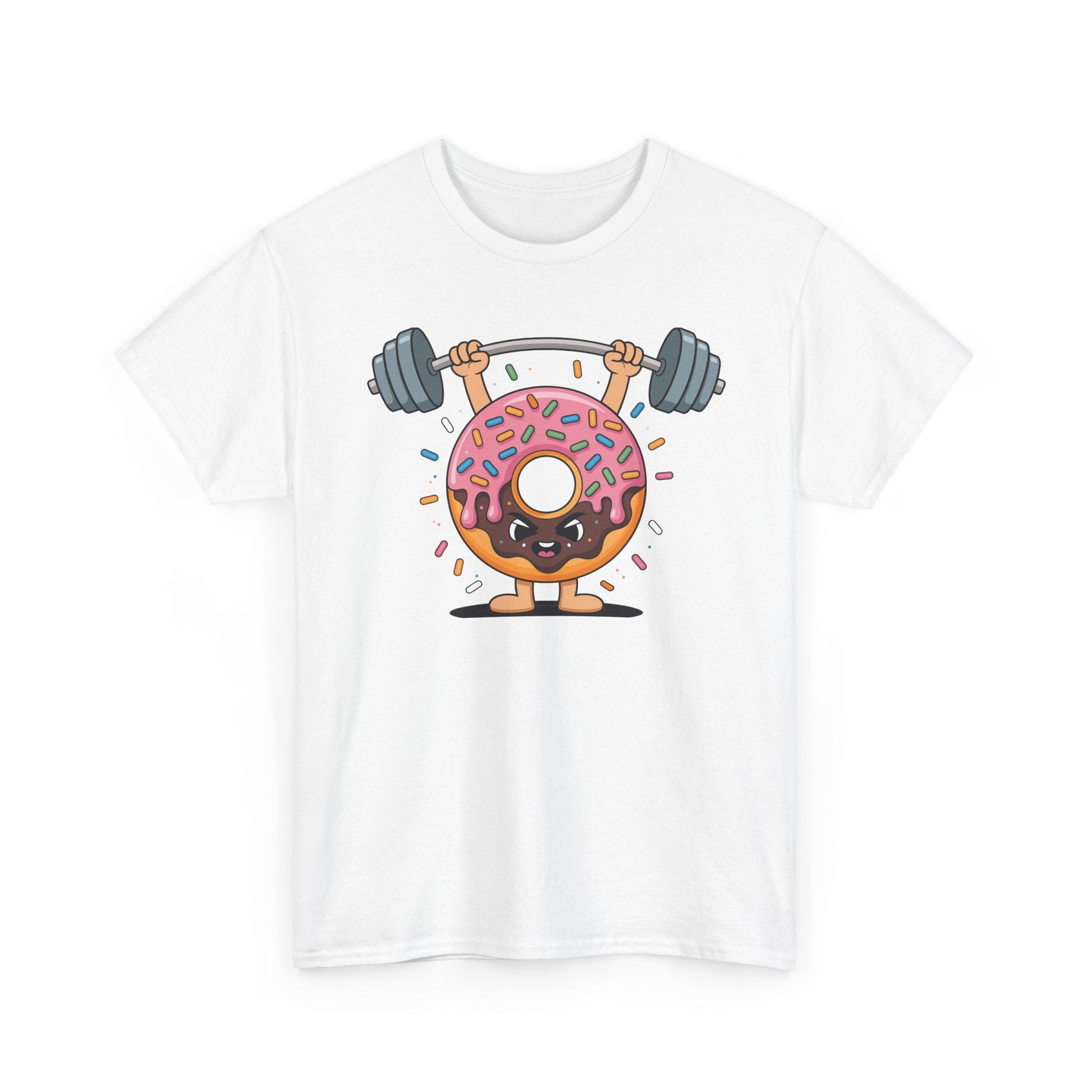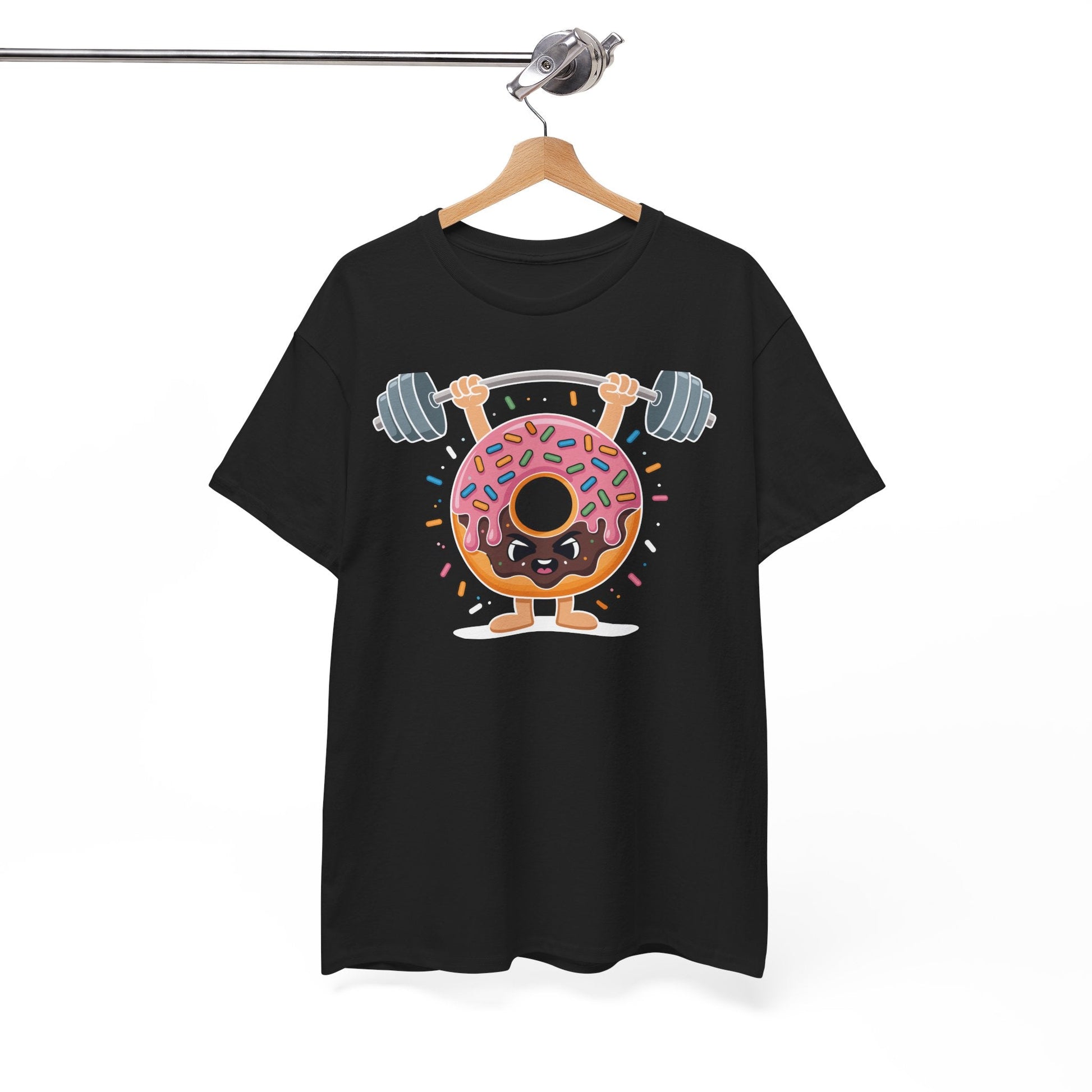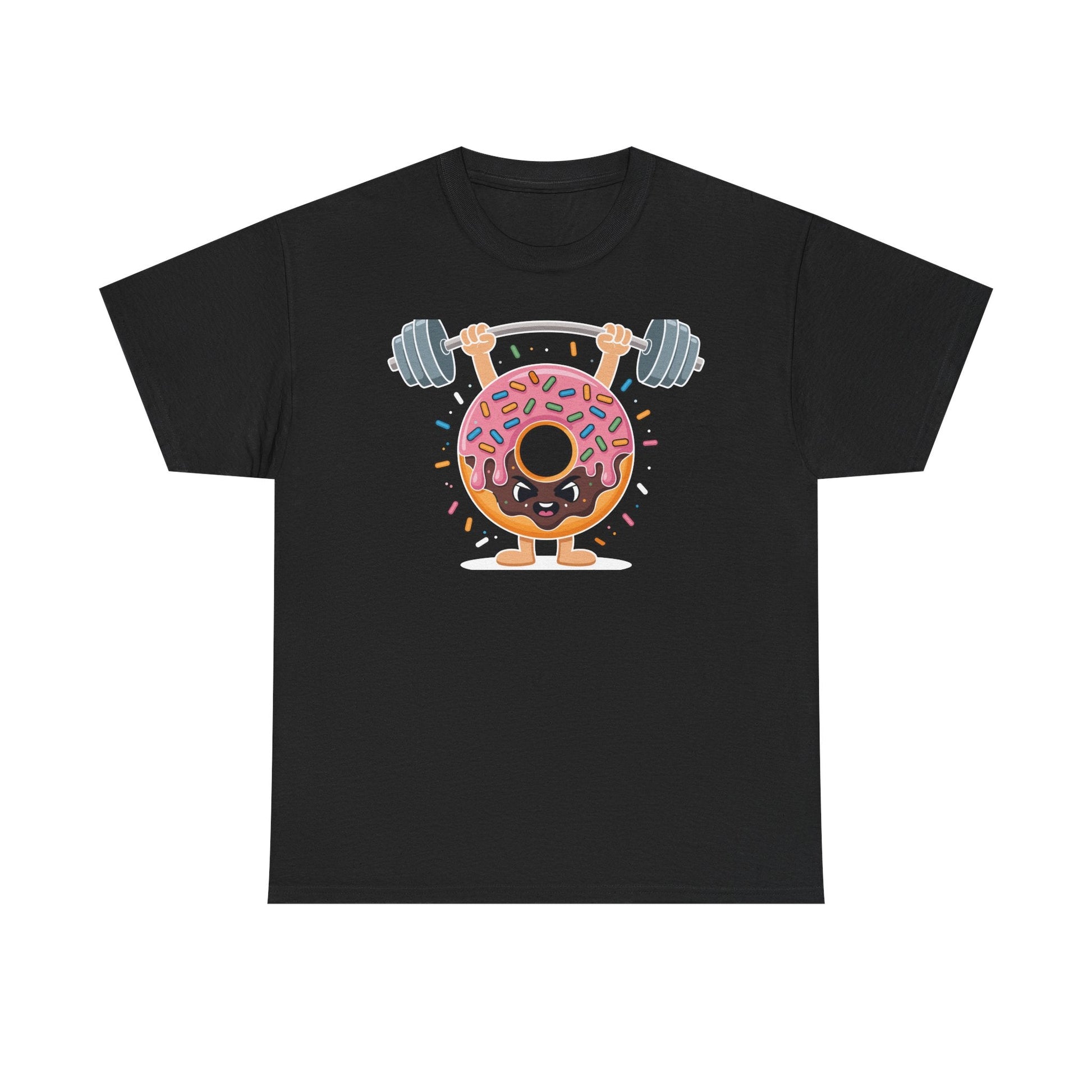 - Donut Humor Graphic Design: Features a weightlifting-themed donut illustration that combines gym culture with foodie fun