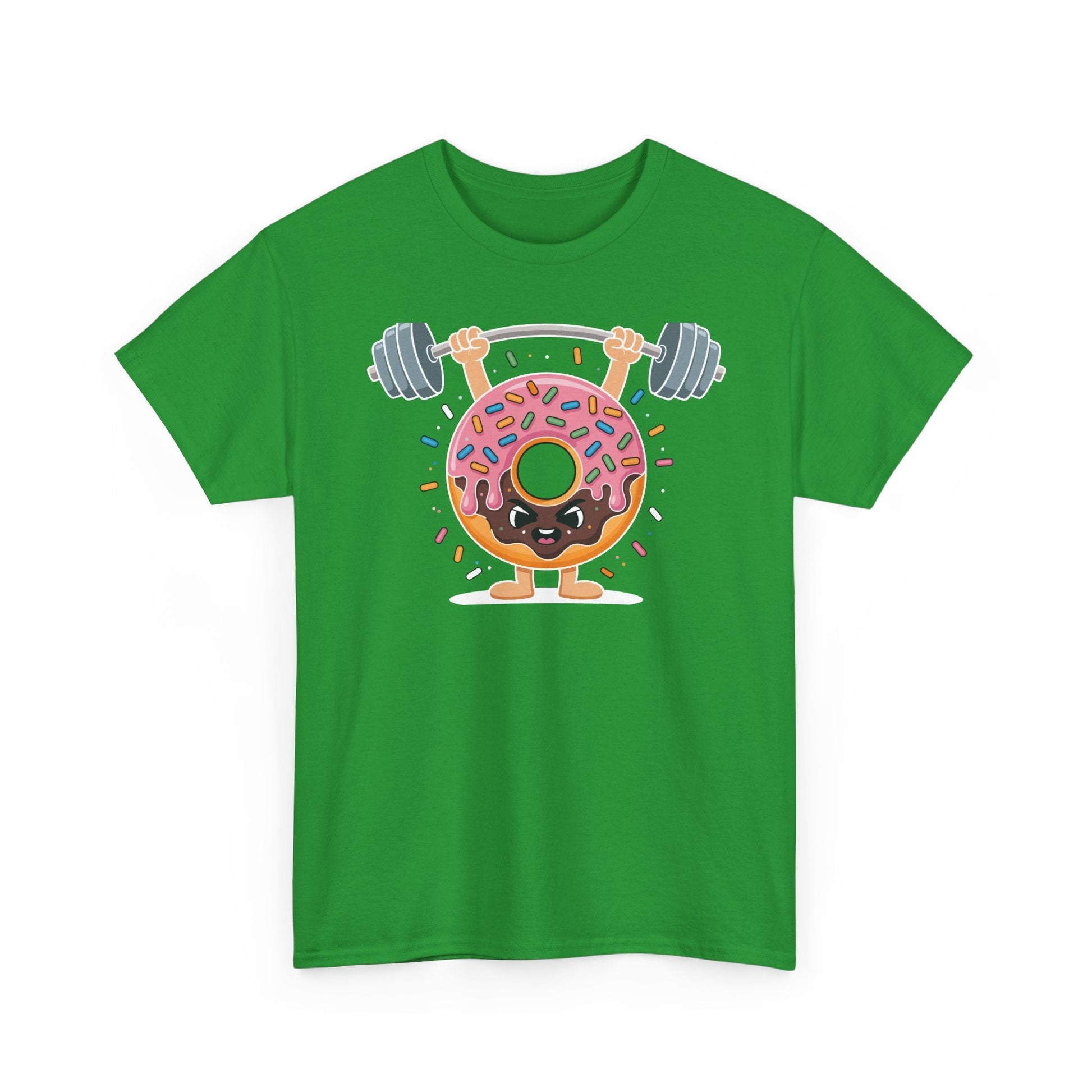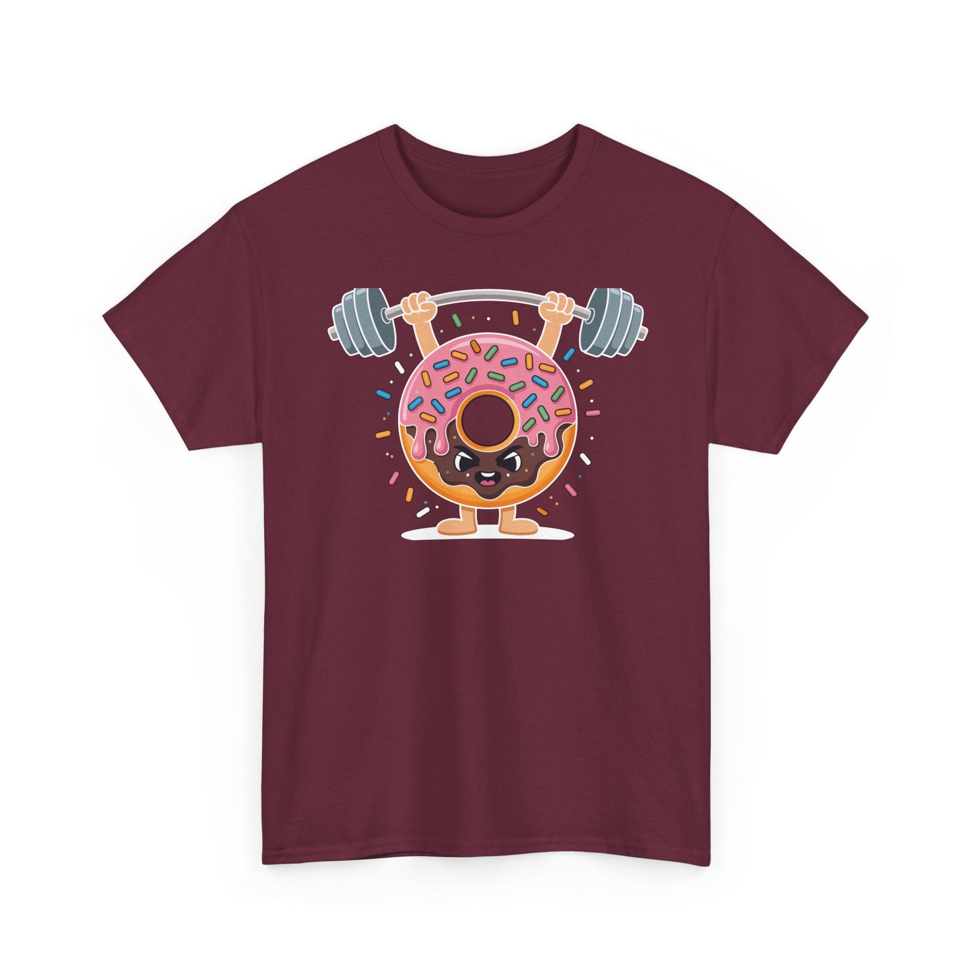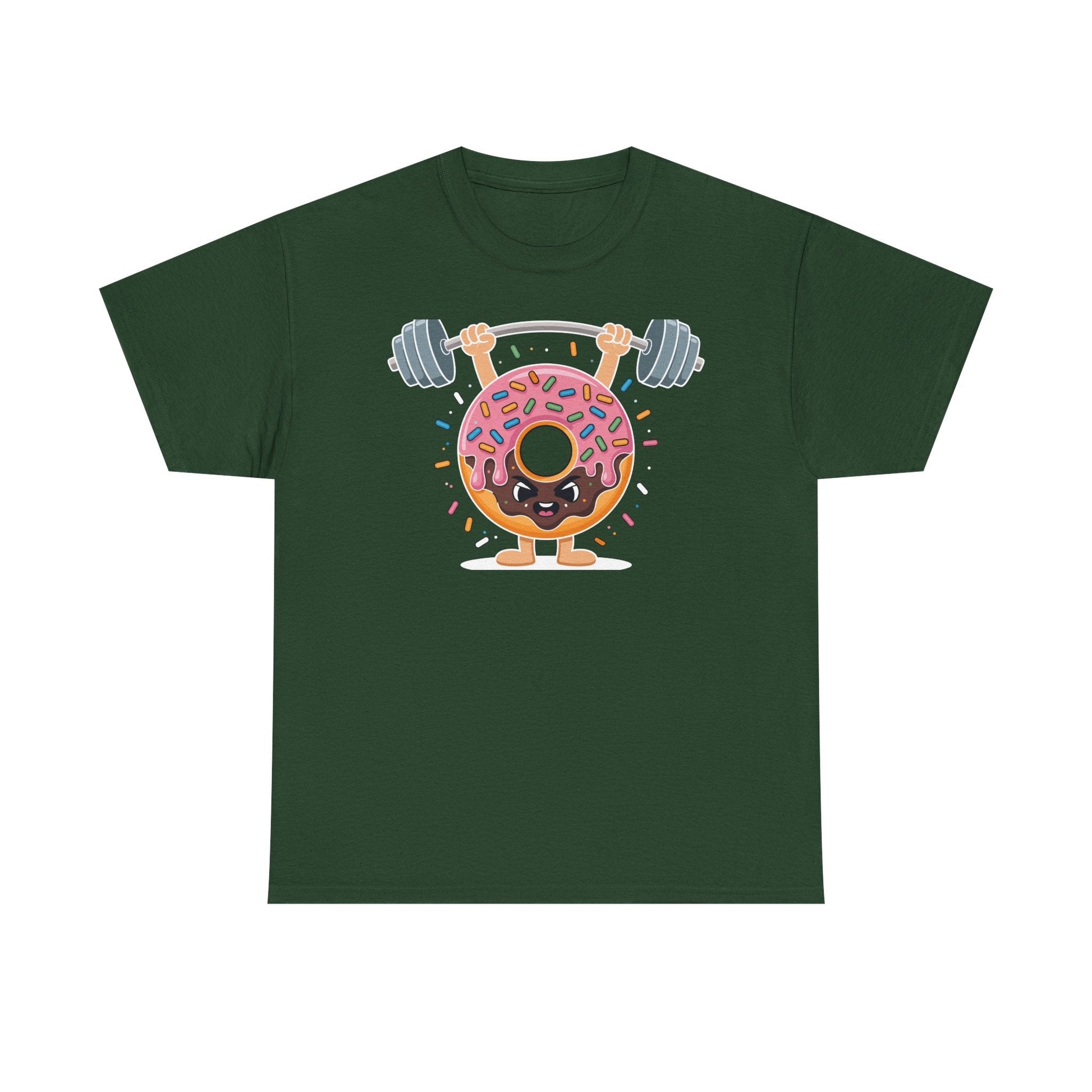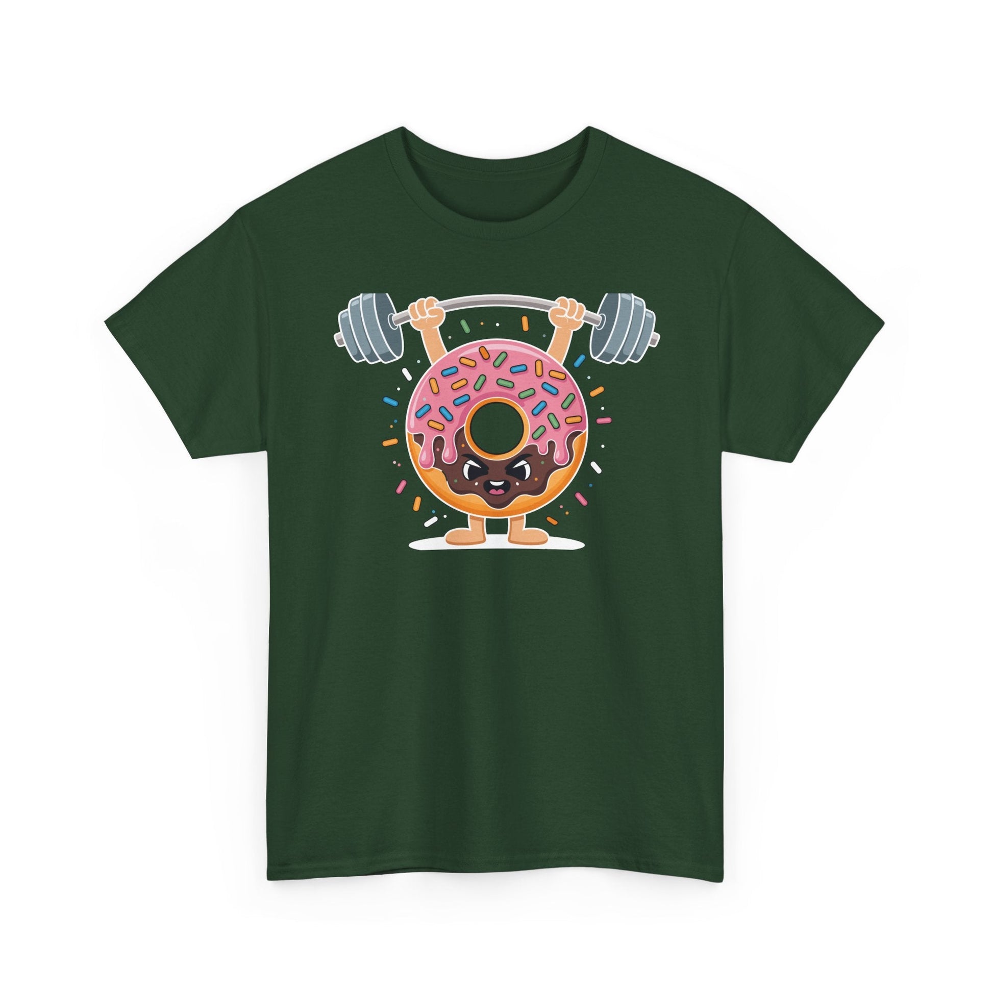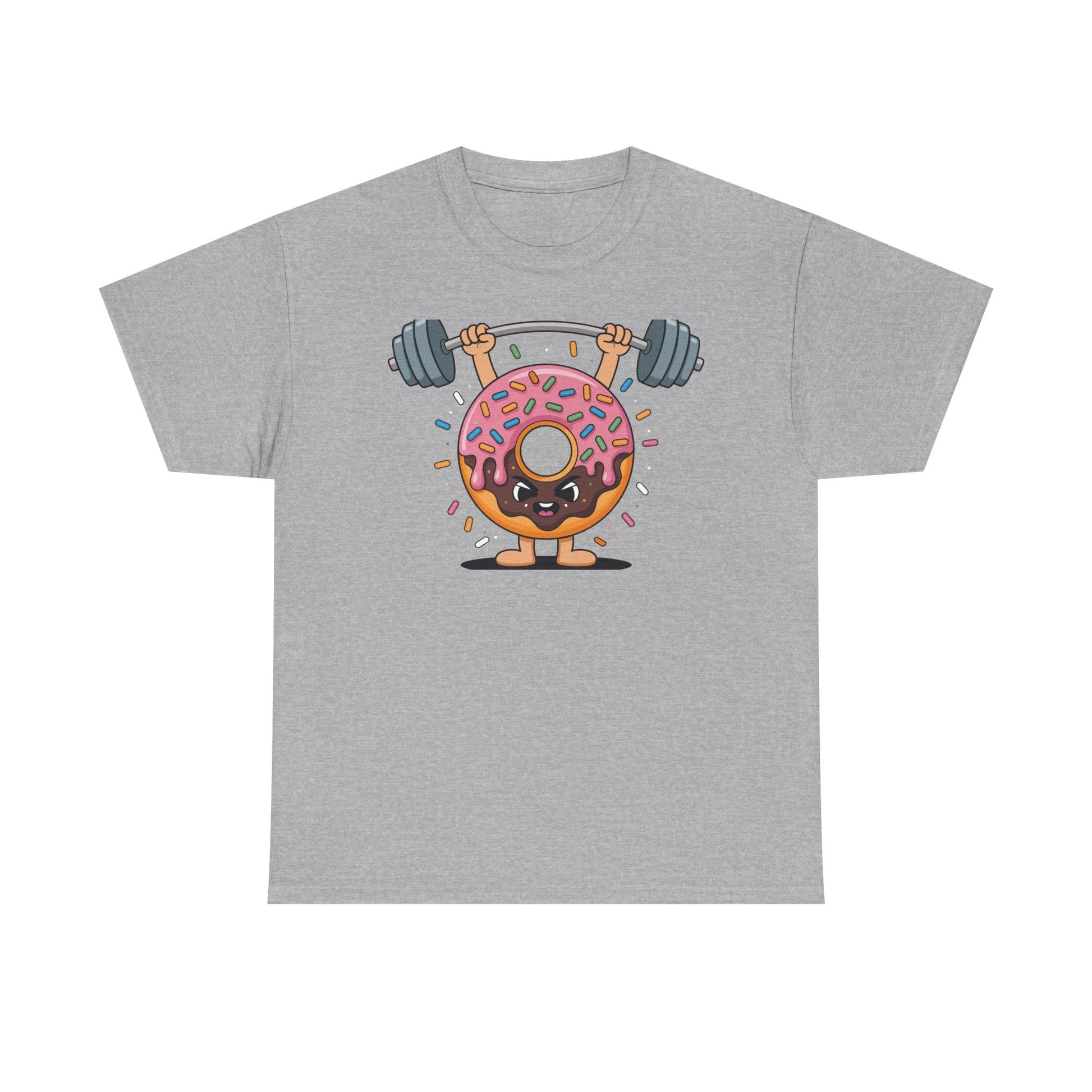- Donut Humor Graphic Design: Features a weightlifting-themed donut illustration that combines gym culture with foodie fun