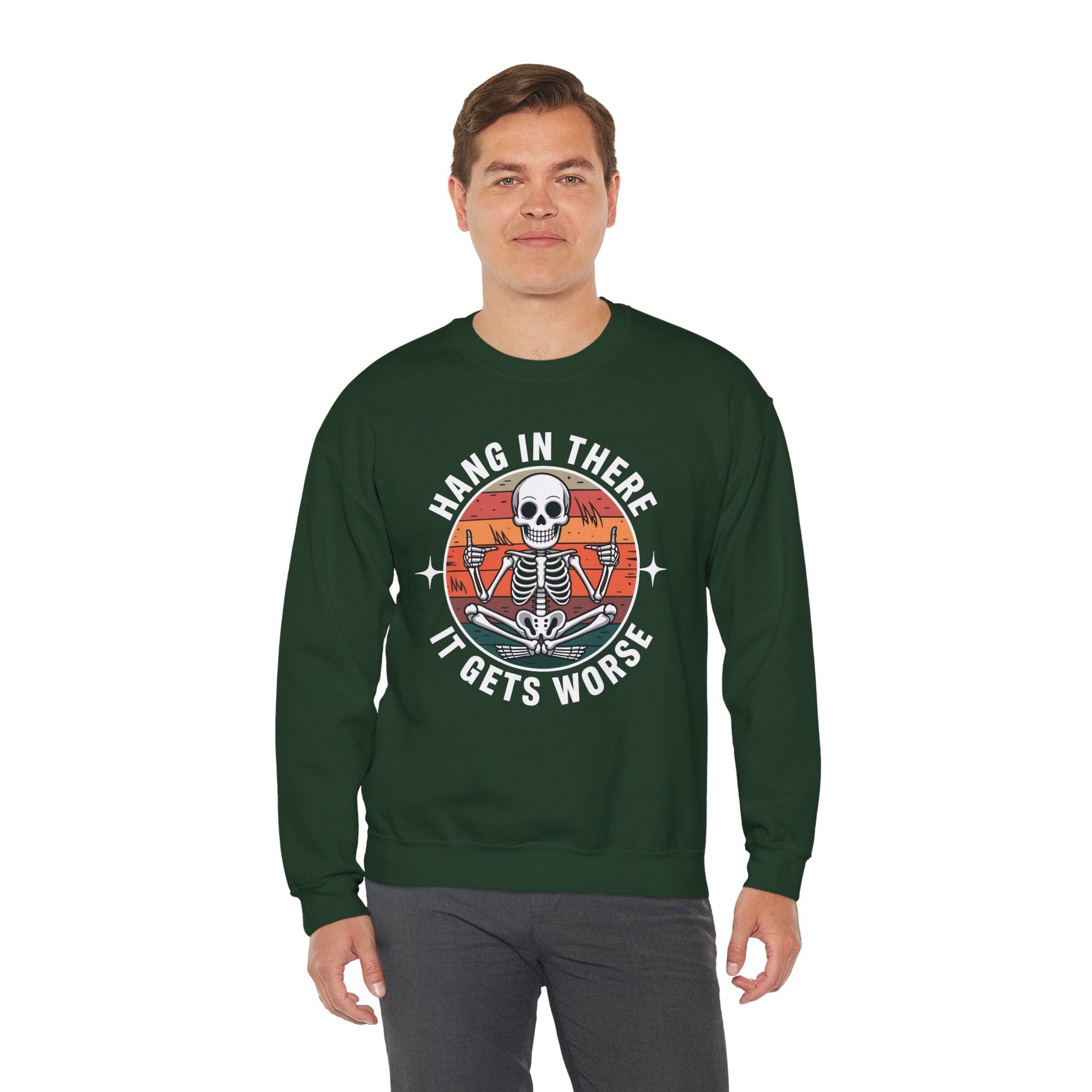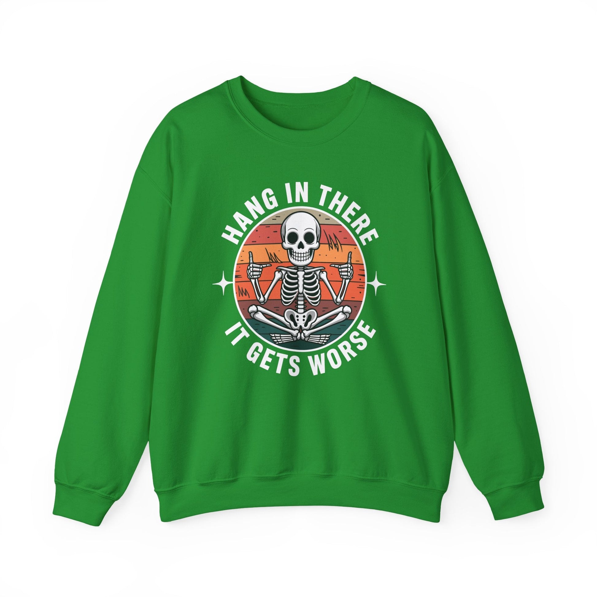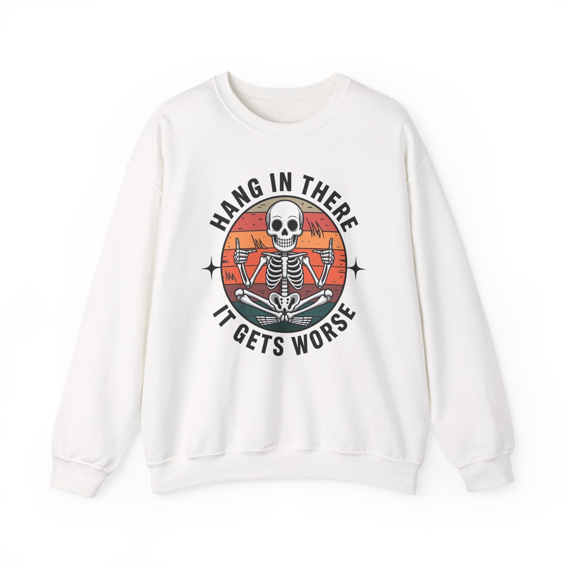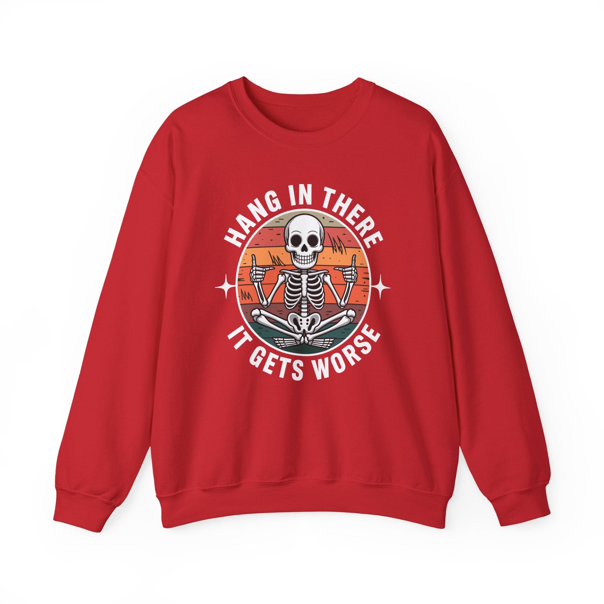 This Hang In There It Gets Worse Sweatshirt features a sarcastic skeleton surrounded by flames, perfect for those with a dark sense of humor. Ideal for those looking for a cozy and edgy addition to their wardrobe, this sweatshirt is great for adults who enjoy unique and bold fashion statements. Perfect for wearing during Halloween or any time you want to add a bit of attitude to your outfit.