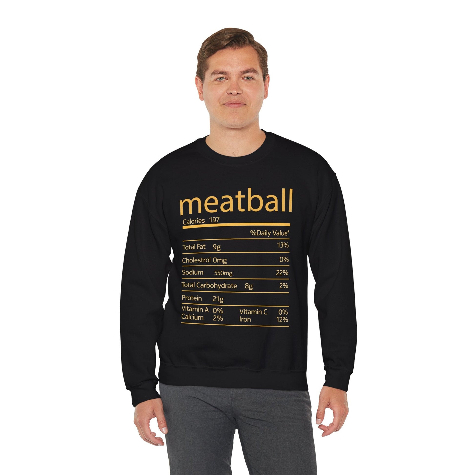 This Sweatshirt features a humorous design with 'Meatball Nutrition Facts' perfect for Thanksgiving and Christmas festivities. It provides a cozy and comfortable fit, making it ideal for the colder months. Suitable for adults who enjoy playful and festive clothing for holiday gatherings.