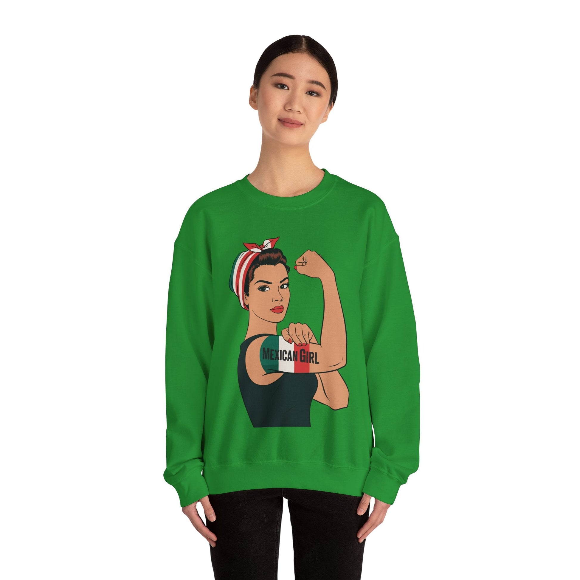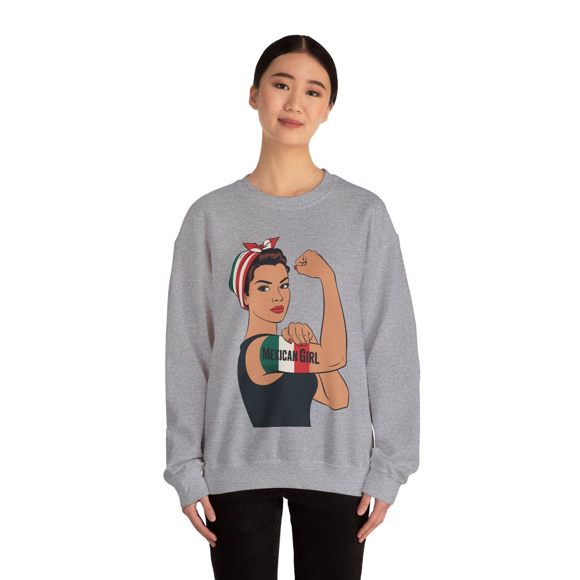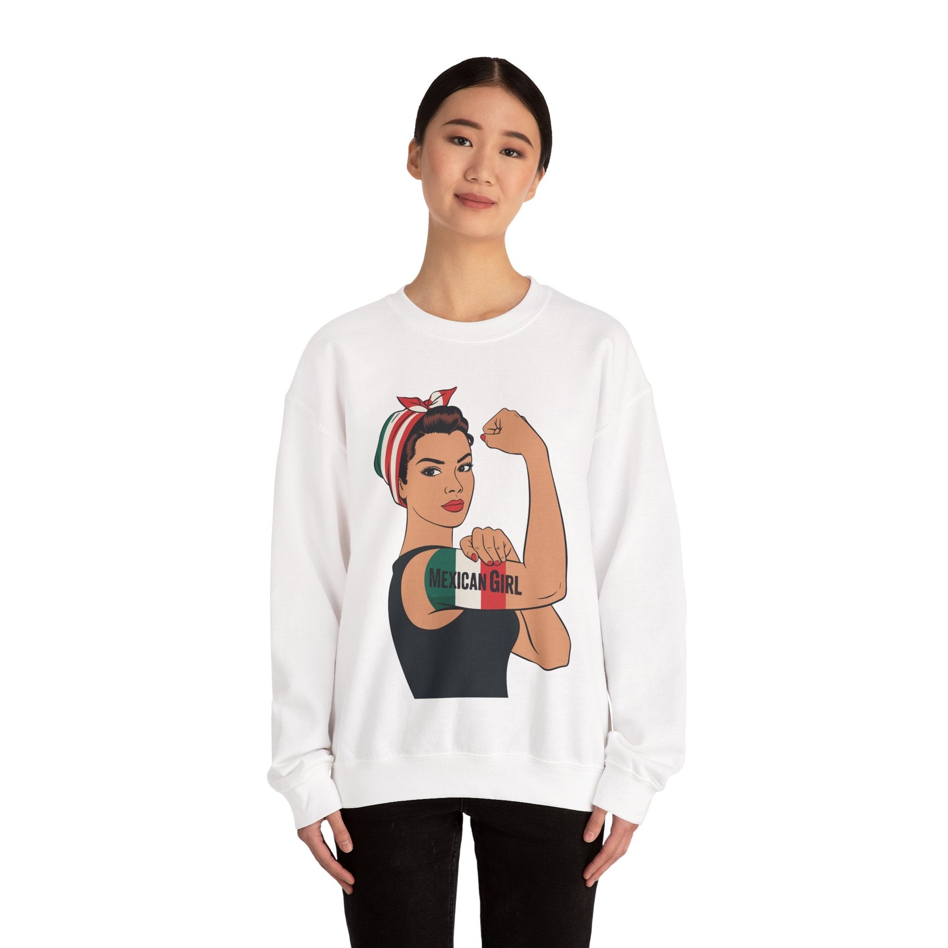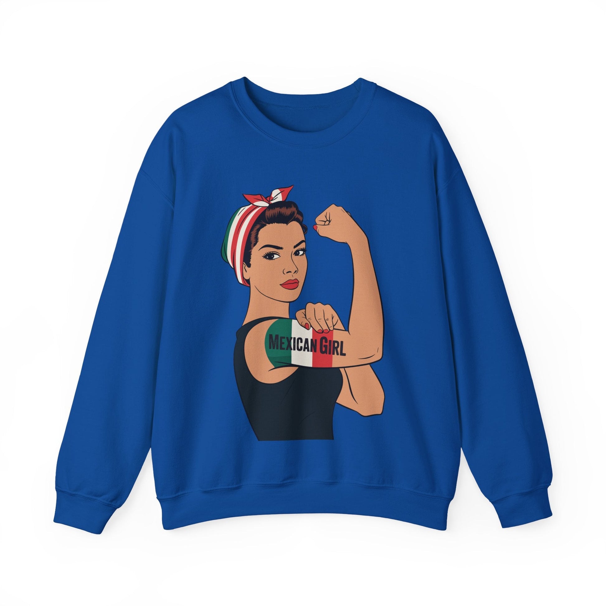 Celebrate Cinco de Mayo in style with this Mexican Girl Mujer Rosie Riveter themed sweatshirt, perfect for a fiesta. Made with a cozy fabric blend of cotton and polyester, this sweatshirt offers a classic fit and durable construction. Ideal for adults looking for a comfortable and stylish option for colder months.