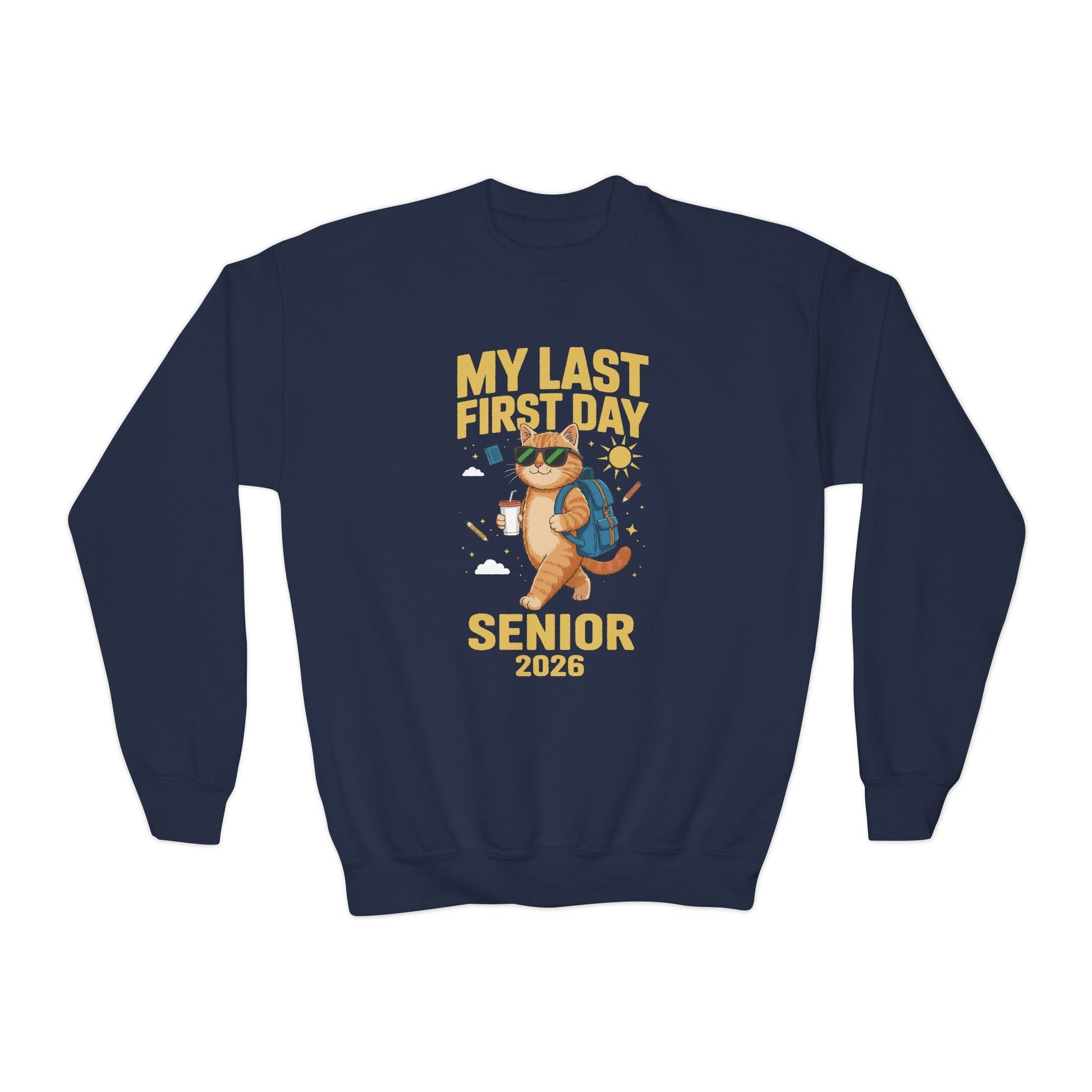 This Youth Sweatshirt with the design 'My Last First Day Senior 2026 Cat Back to School Cool Class' is perfect for any child heading back to school in style. The cozy sweatshirt gives off a cool and confident vibe, making it a great addition to a kid's wardrobe for the first day of school. Ideal for children entering their senior year in 2026, this sweatshirt is relevant for back-to-school season and school-related occasions.