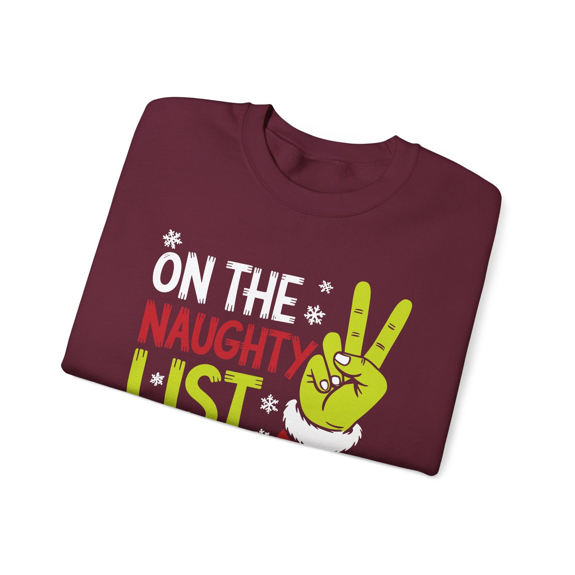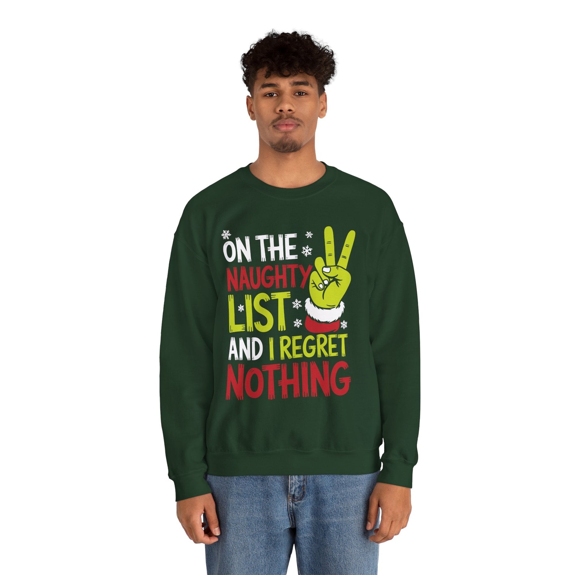Stay cozy and festive this holiday season with this 'On The Naughty List And I Regret Nothing' Funny Christmas Sweatshirt. Perfect for adults who want to add a touch of humor to their holiday wardrobe. Ideal for Christmas parties, holiday gatherings, and festive celebrations.