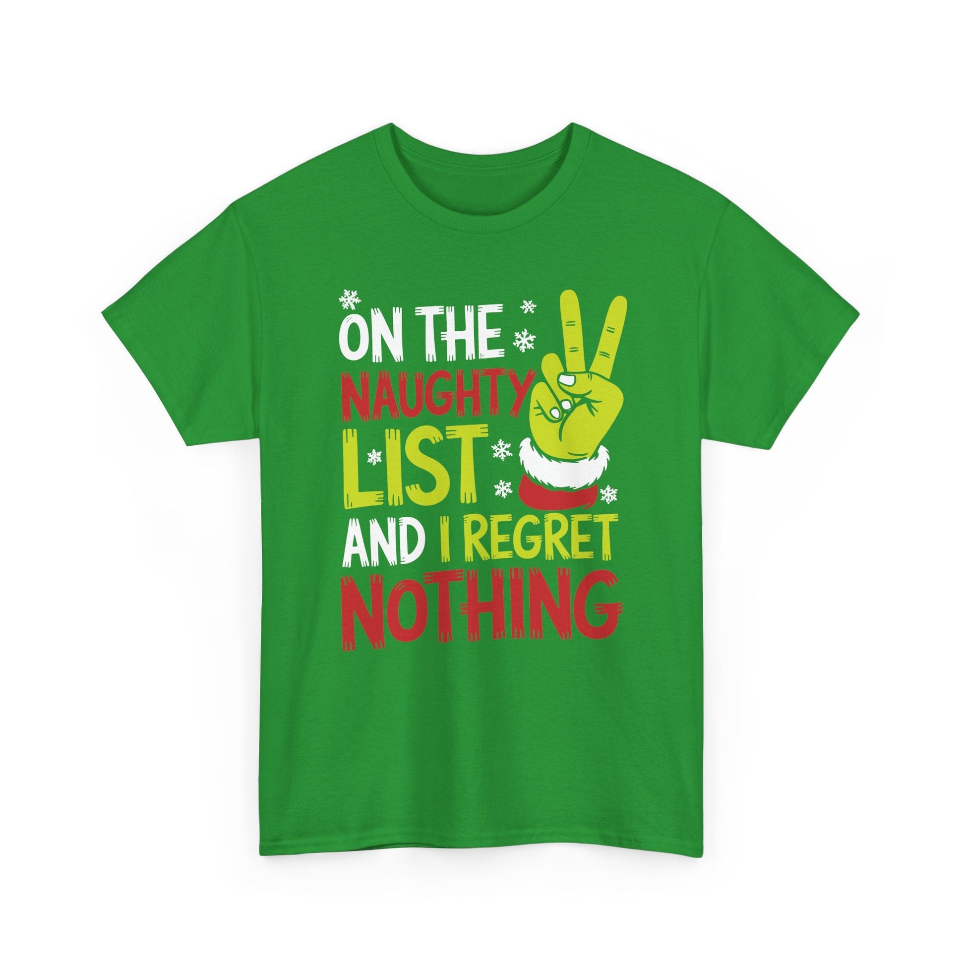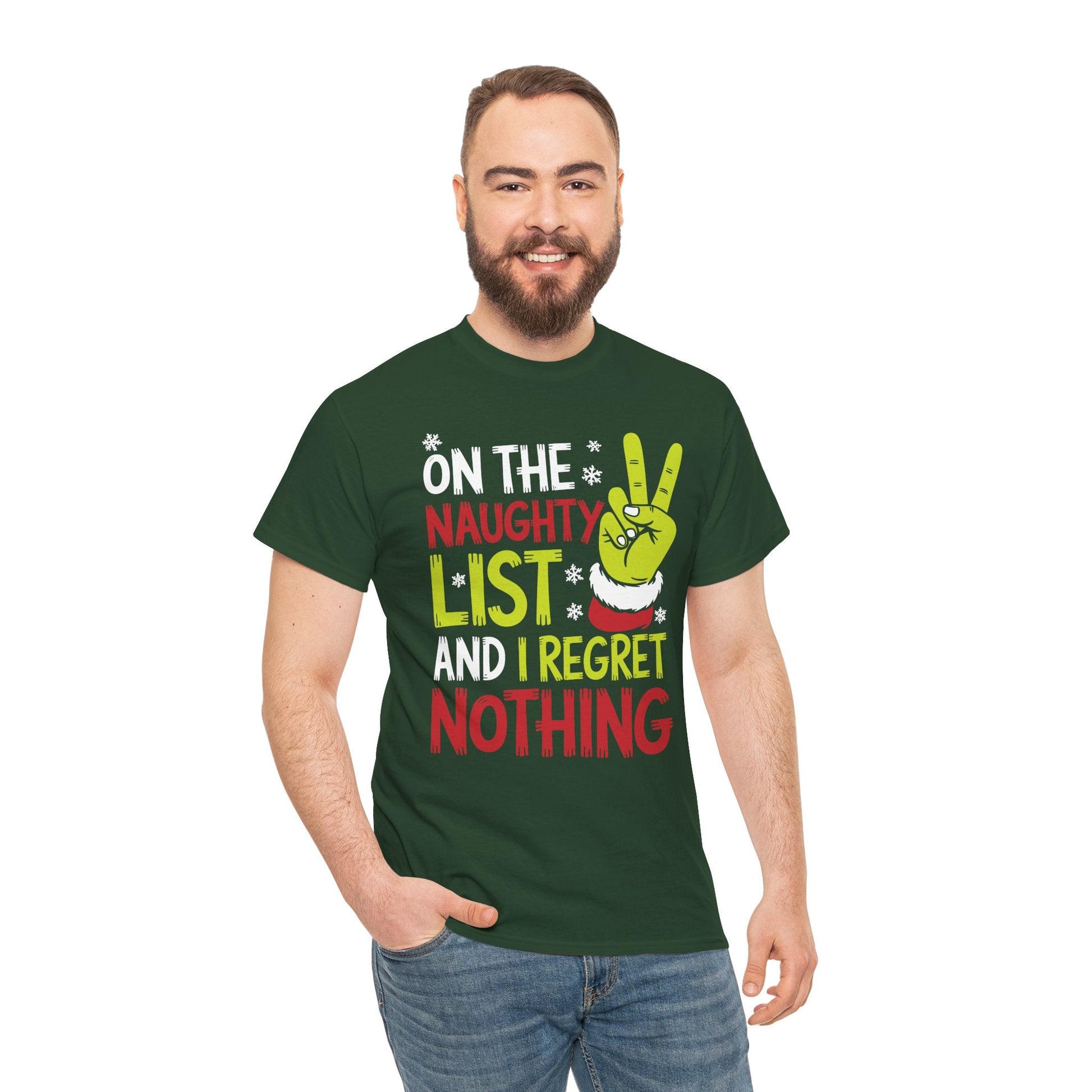 Funny Christmas T-Shirt with 'On The Naughty List And I Regret Nothing' design. Perfect for those with a fun and rebellious spirit during the holiday season. This unisex tee is made from durable fabric, featuring a ribbed knit collar and shoulder tape for added stability. Suitable for adults and ethically produced in Nicaragua.