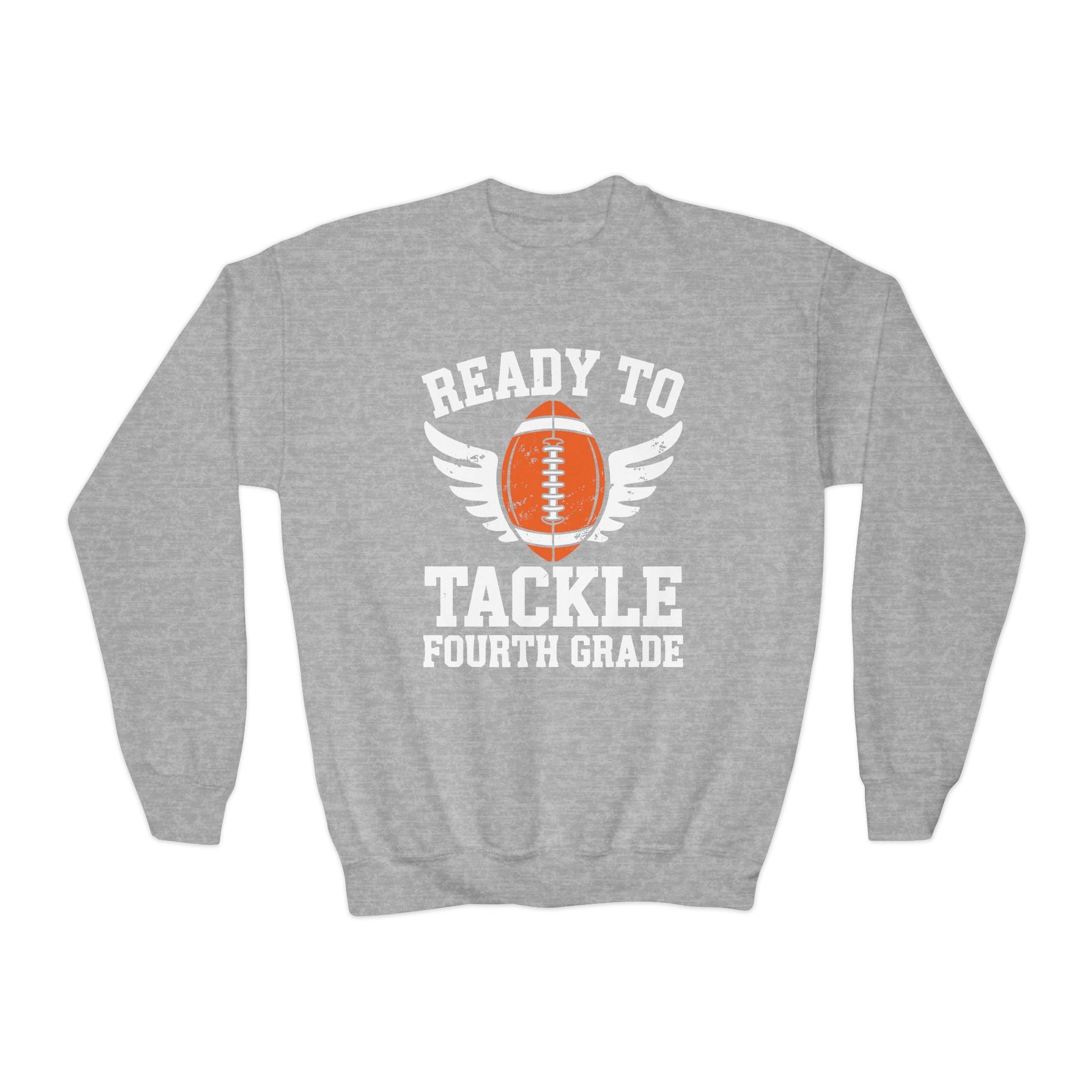 This Ready To Tackle Fourth Grade Back To School Football Sweatshirt is perfect for young students getting geared up for the school year. The design exudes a sporty and playful vibe, making it a great addition to a child's back to school wardrobe. Ideal for young football fans and students ready to tackle the new school year. Relevant for back to school season and sporting events.