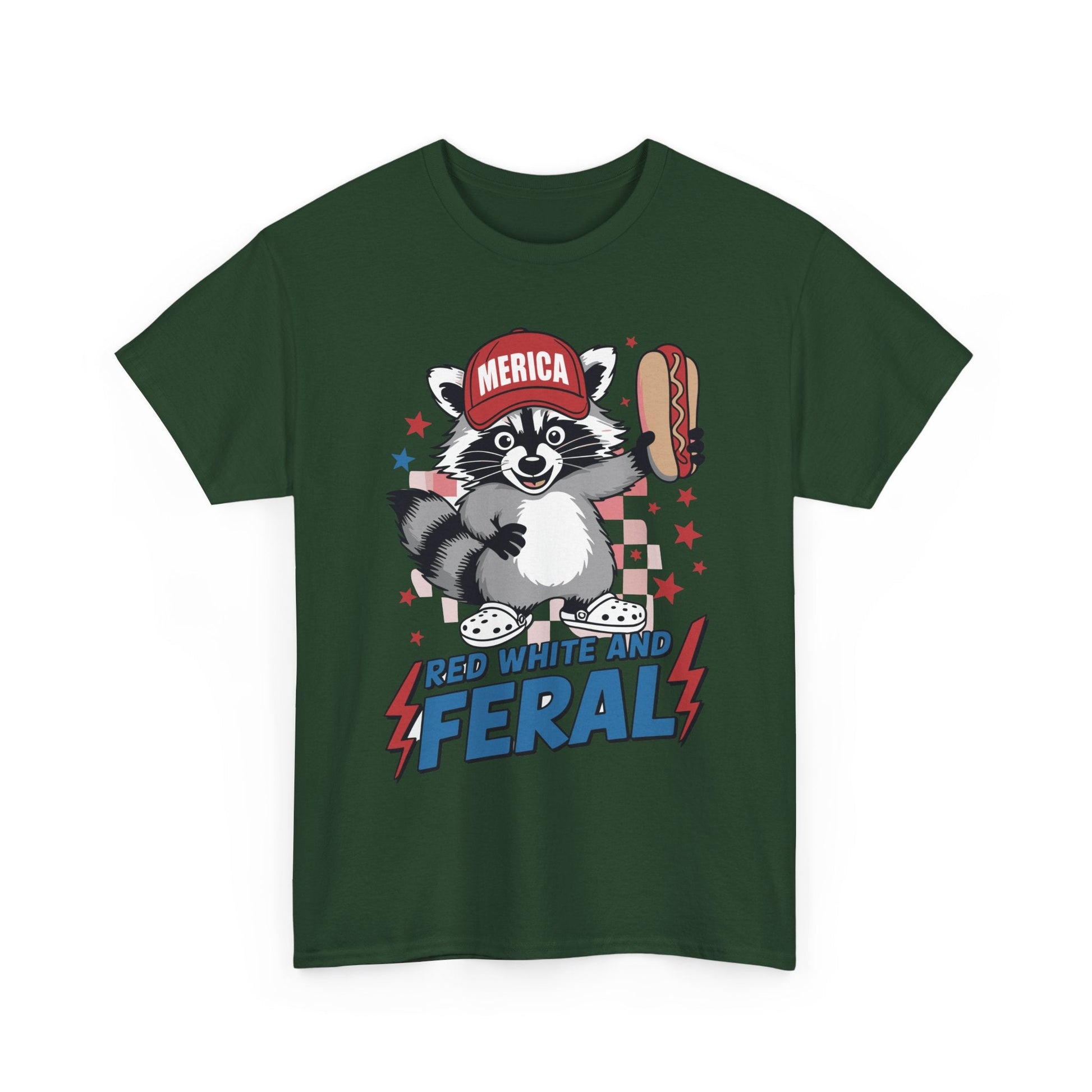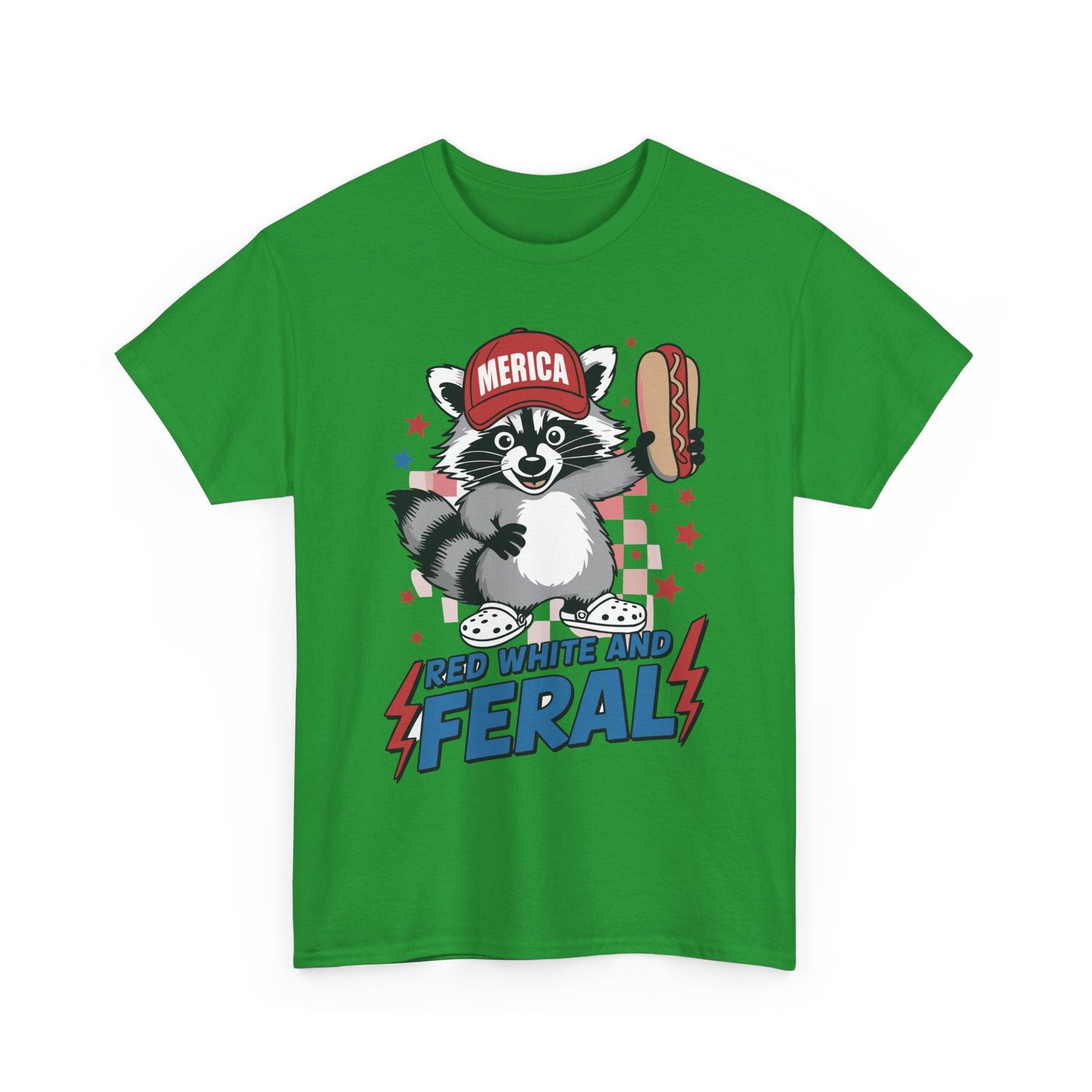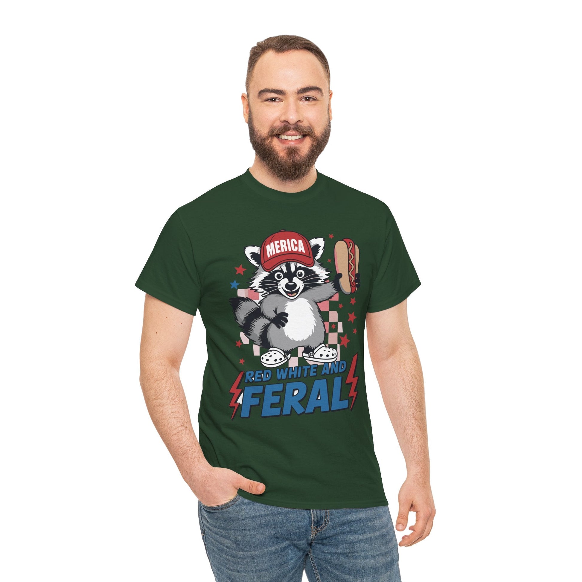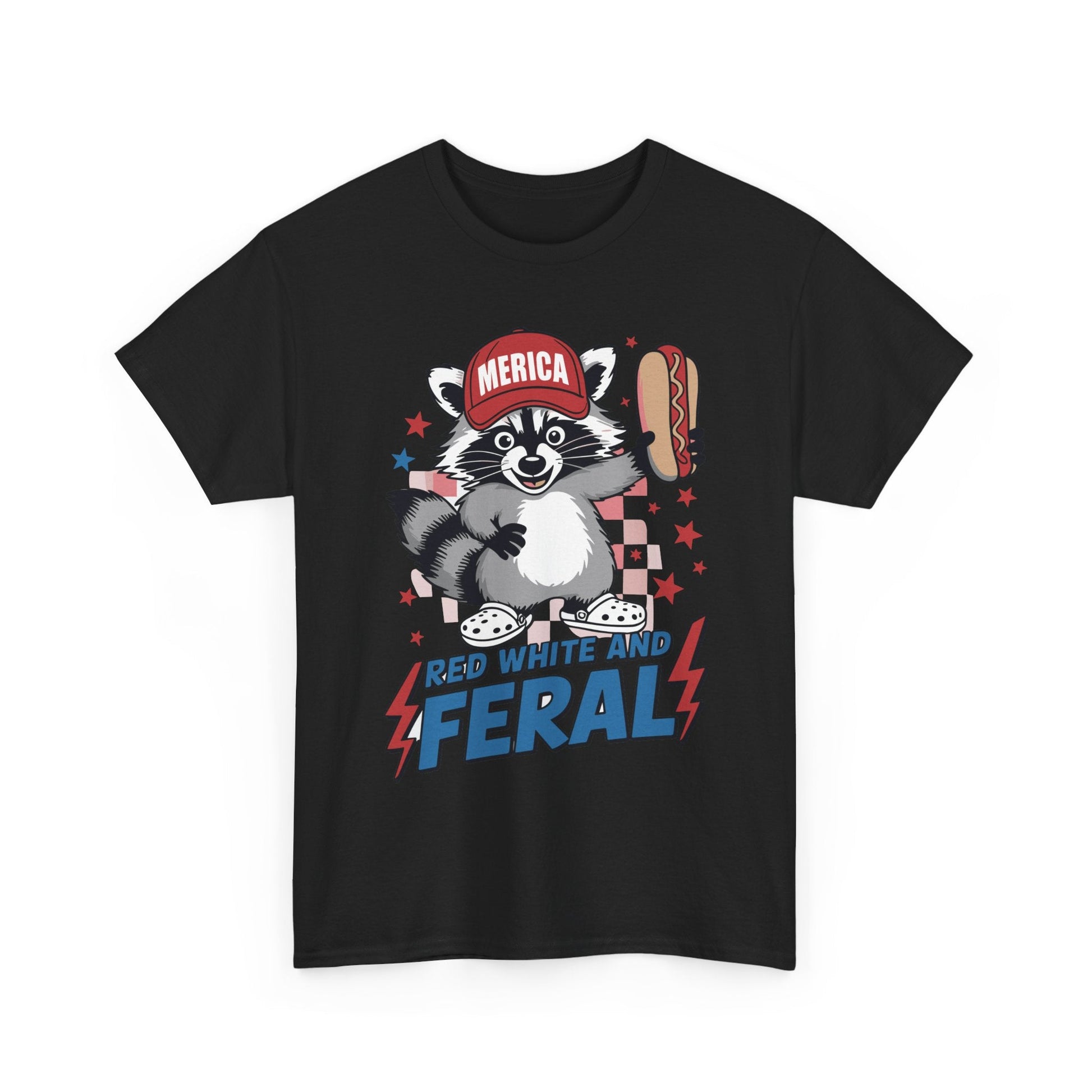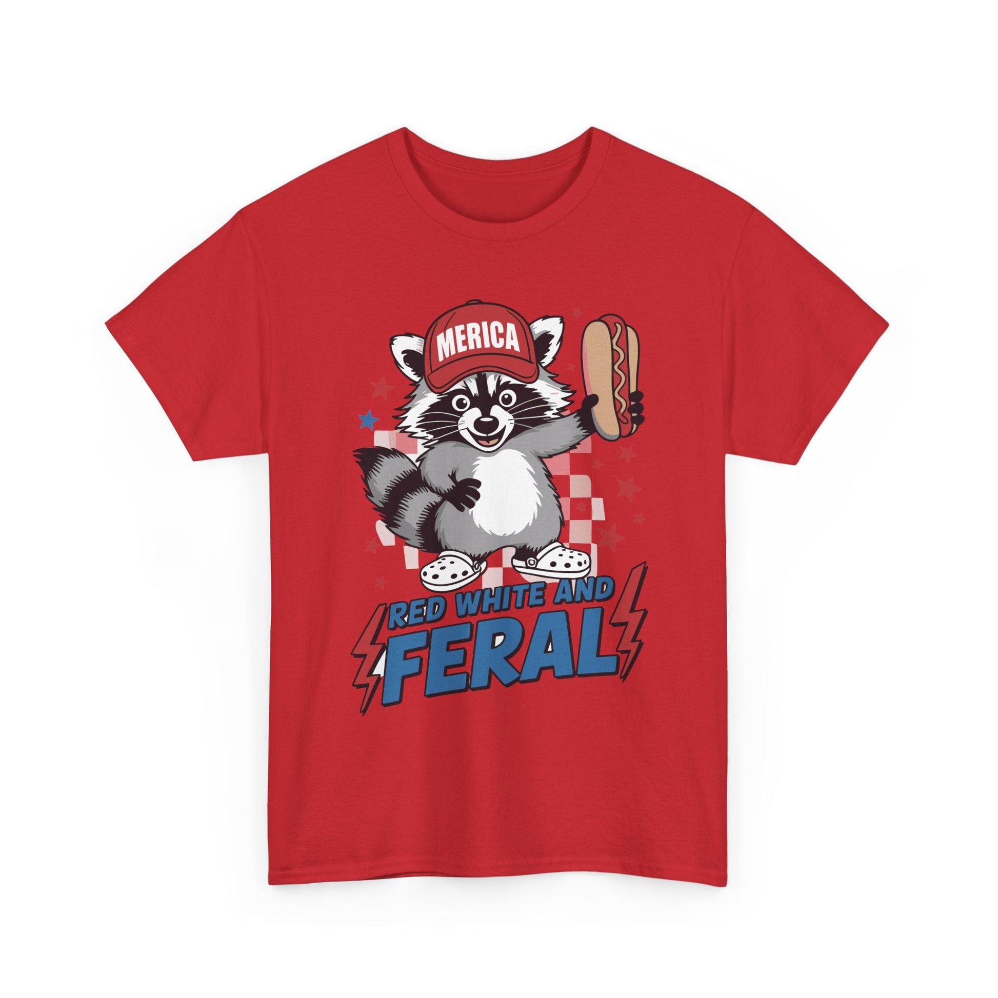 A vibrant and festive T-Shirt featuring a red, white, and feral raccoon design with a 4th of July saying meme. Perfect for those looking to add a touch of humor and patriotism to their Independence Day celebrations. This unisex heavy cotton tee is ideal for adults seeking a comfortable and durable shirt for year-round wear.