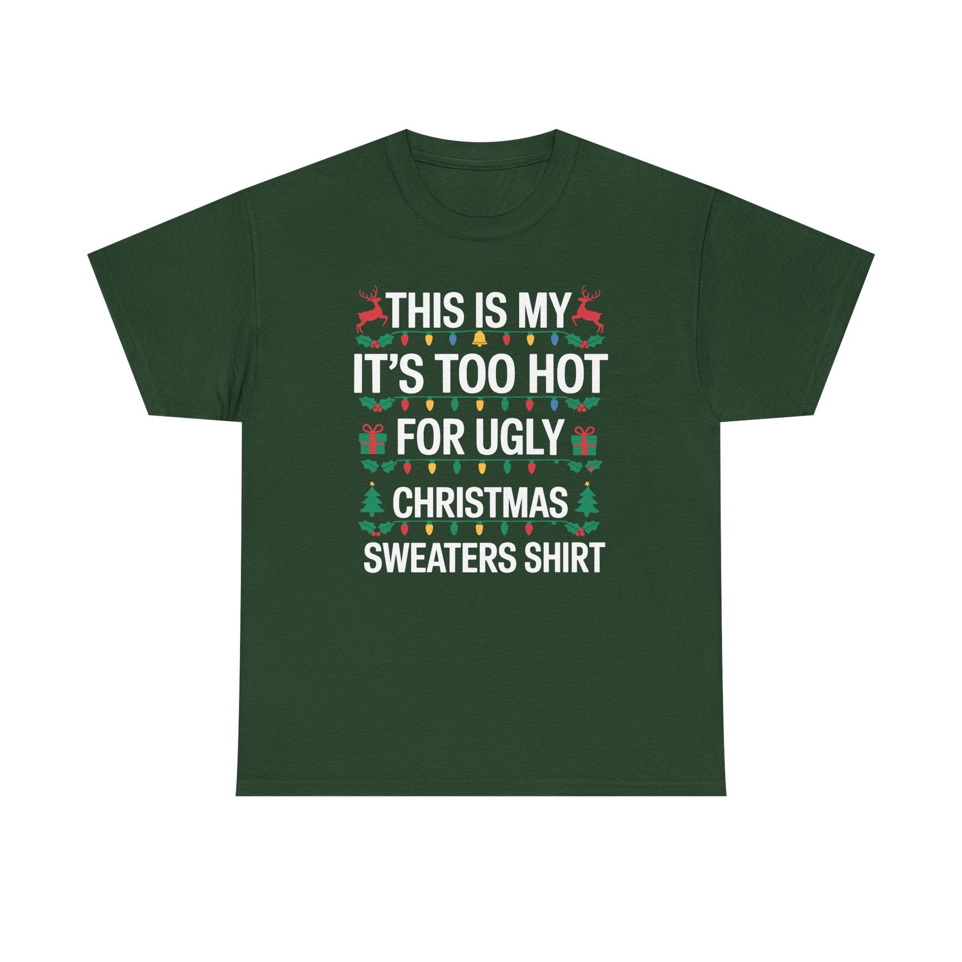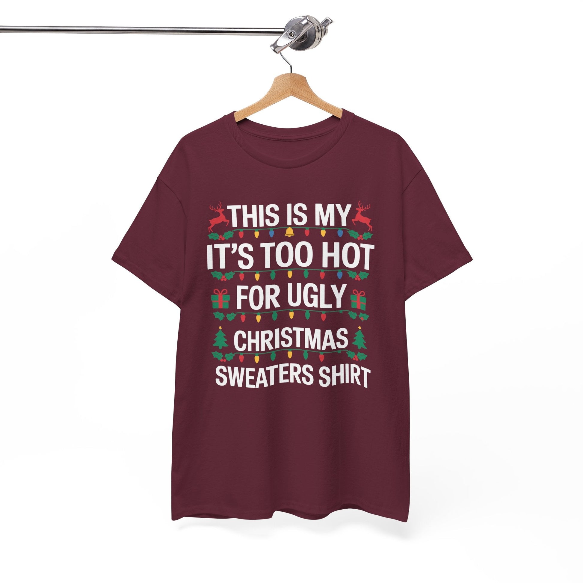 This Too Hot for Ugly Christmas Sweater Funny Xmas T-Shirt is perfect for anyone looking to add a touch of humor to their holiday wardrobe. It gives off a festive and lighthearted vibe, making it great for holiday parties, family gatherings, or just everyday wear during the Christmas season. Target audience includes men and women who enjoy unique, fun holiday attire.